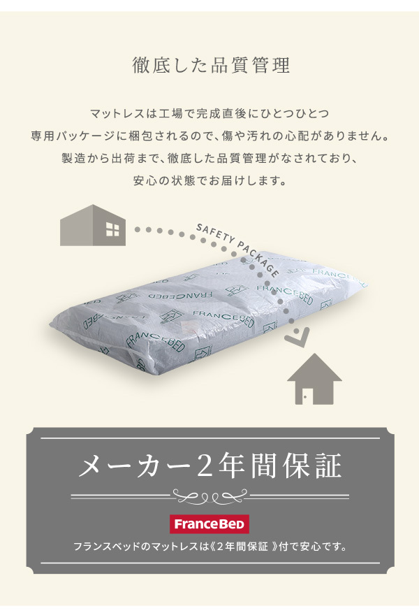 このマットレスは日本製であり、高品質な材料を使用しています。そのため、安心してご使用いただけます。フランスベッドならではの技術と品質を感じながら、ぐっすりと眠ることができることでしょう。快適な睡眠を手に入れて、毎日を元気に過ごしましょう!