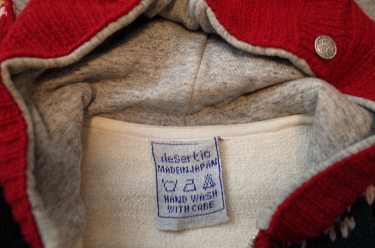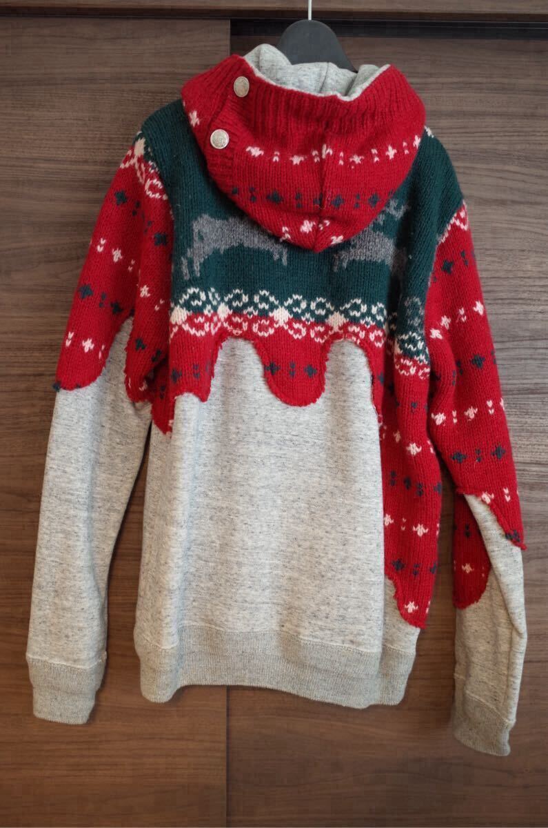デザーティック のリキッドパーカーになります。ヴィンテージのニットとパーカーを解体再構築して作られております。その名の通り、リキッド(液)状のデザイン、クリスマスを連想させるよなニットのデザインとパーカーの融合がたまらないです。