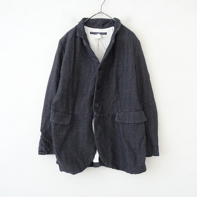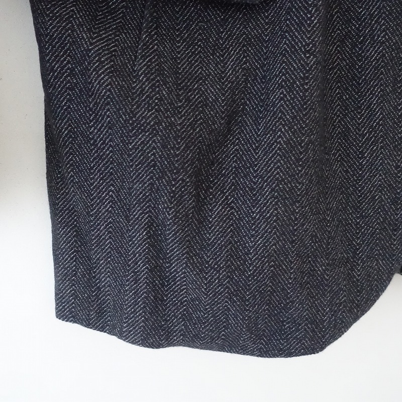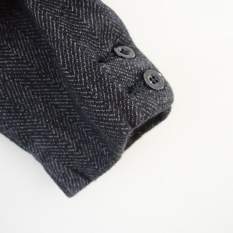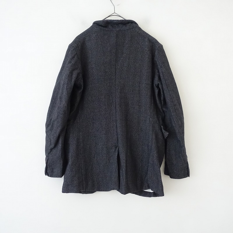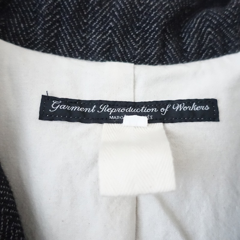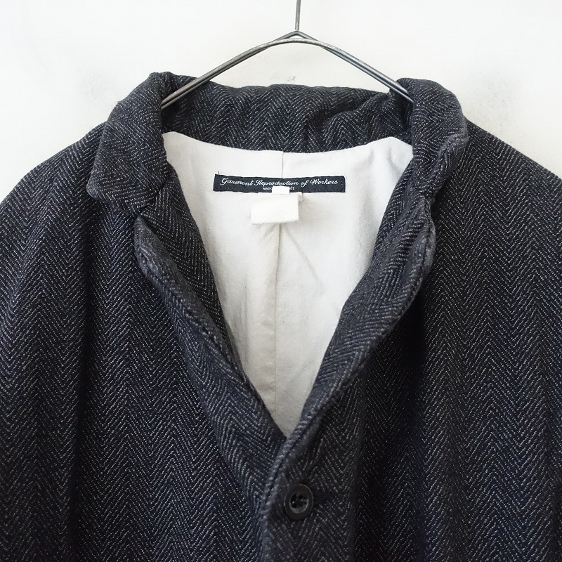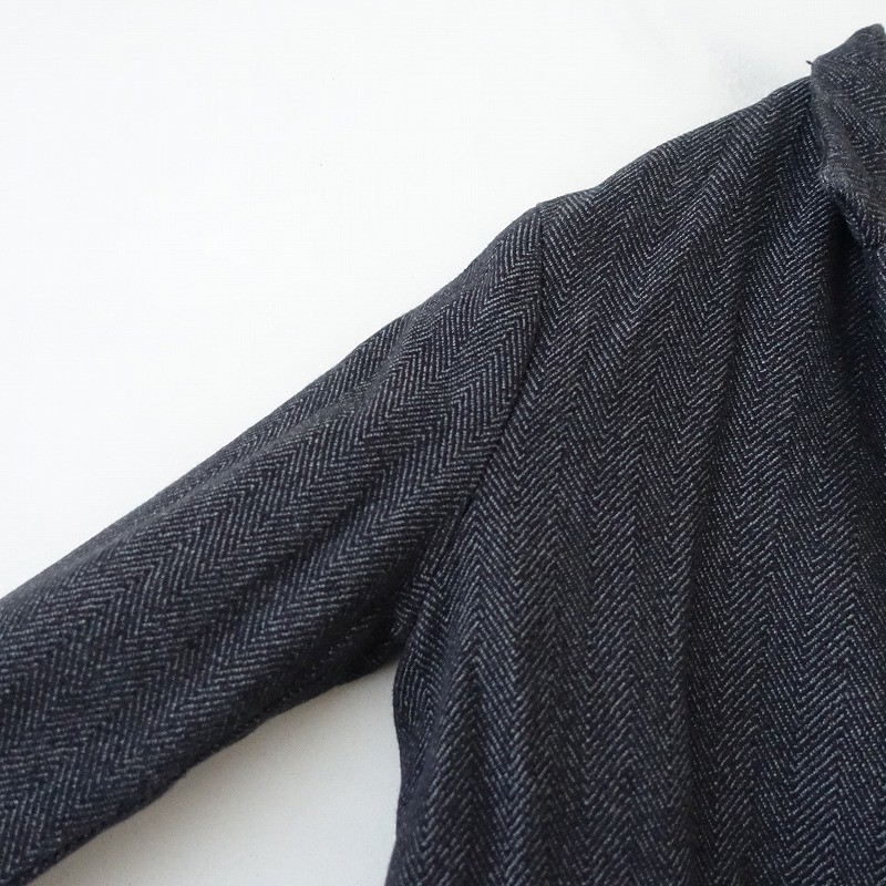 | GARMENT REPRODUCTION OF WORKERSのロングジャケットです。カラーはブラック×グレーで、大柄のヘリンボーン地で仕立てられており、裏地が付いております。着丈の長いシルエットになっており、フロントボタン開閉で着脱でき、最下部ボタンのみ比翼仕立てで袋状になったデザインです。両腰にフラップポケット付き、バックベント入りです。 |