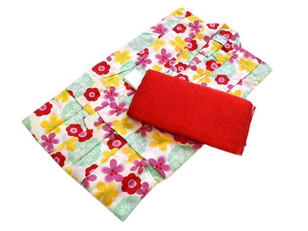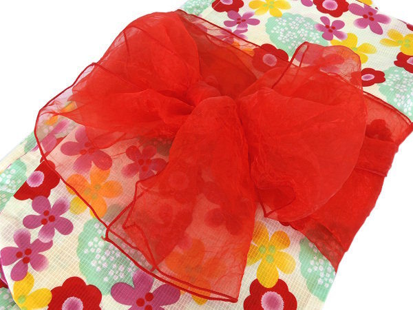 着物美人 女の子浴衣 帯 2点セット 女児 キッズ ジュニア 子供浴衣 ゆかた 綿紅梅 変り織り 7歳 8歳 120 【 オフ白 赤 】612500