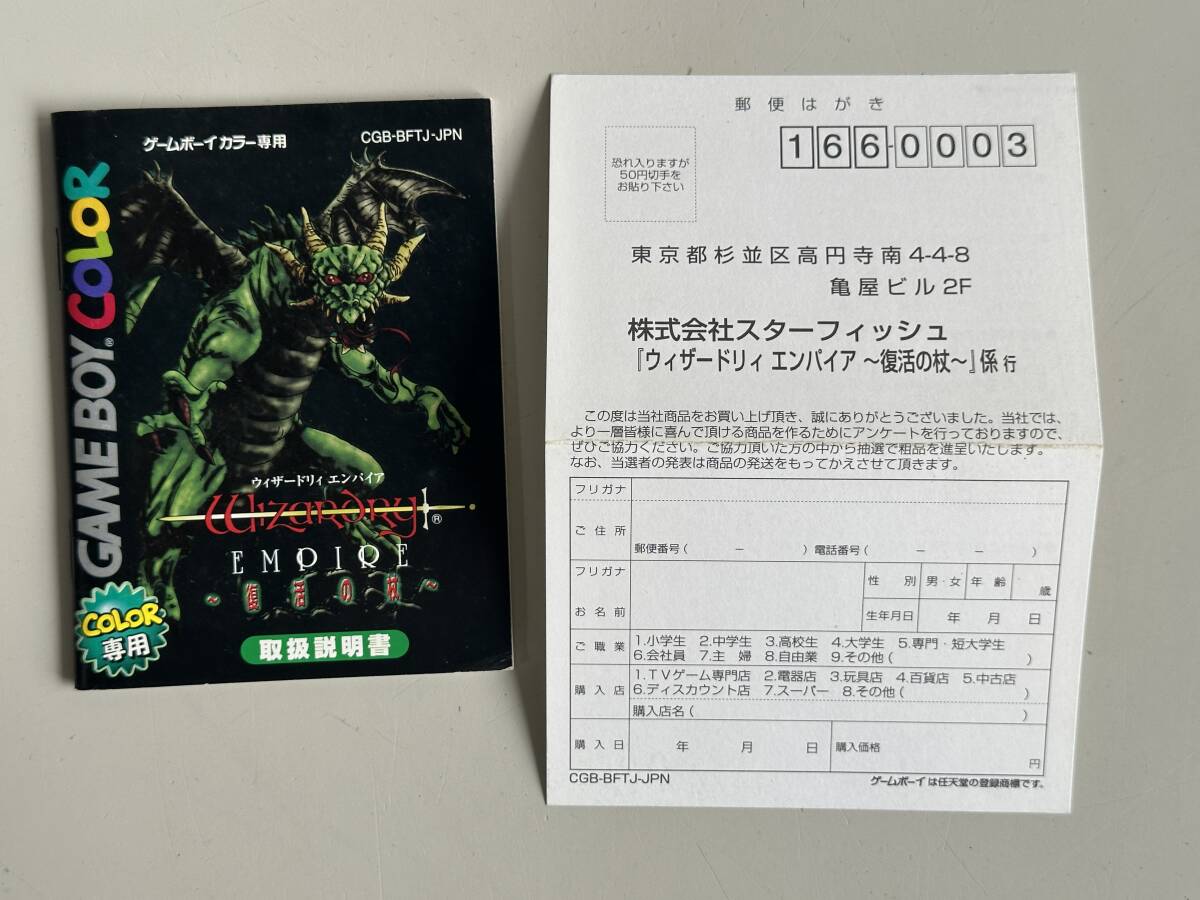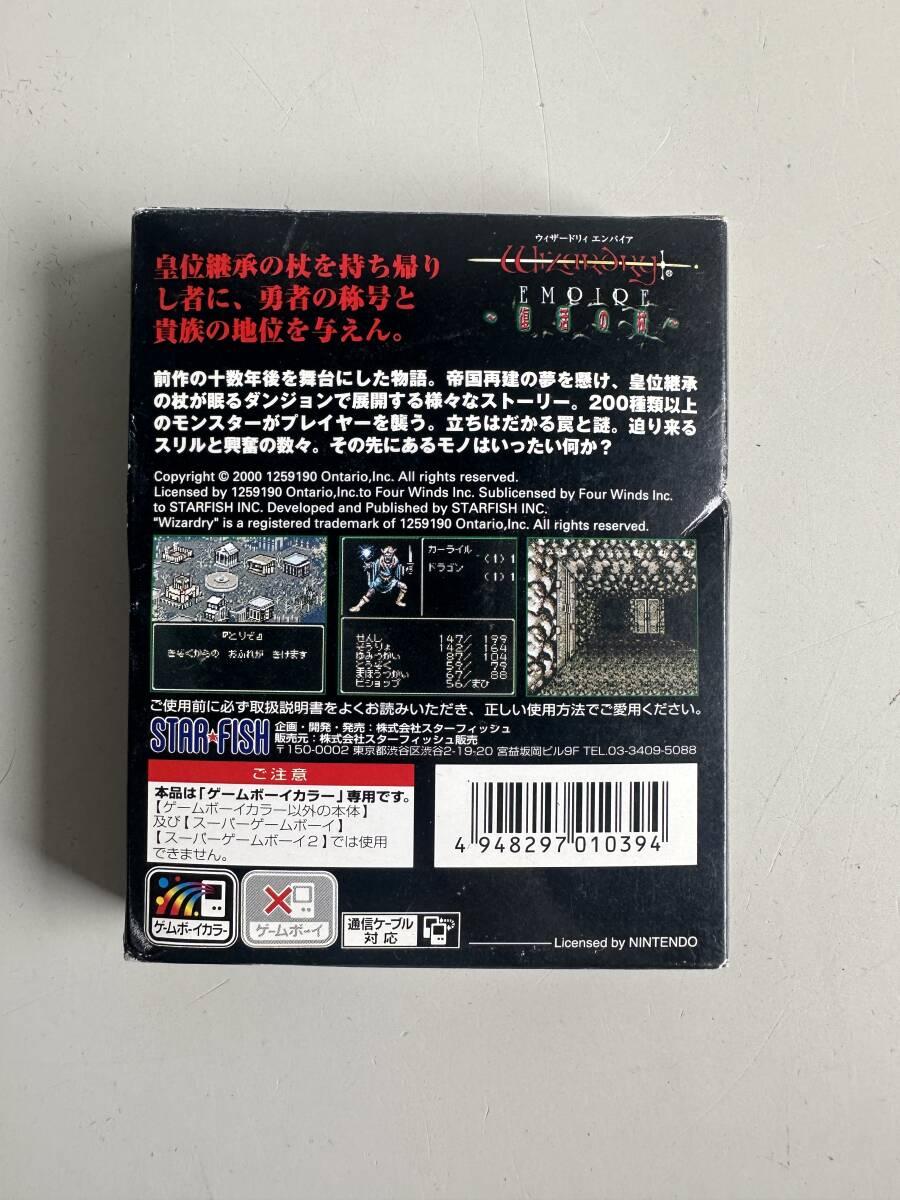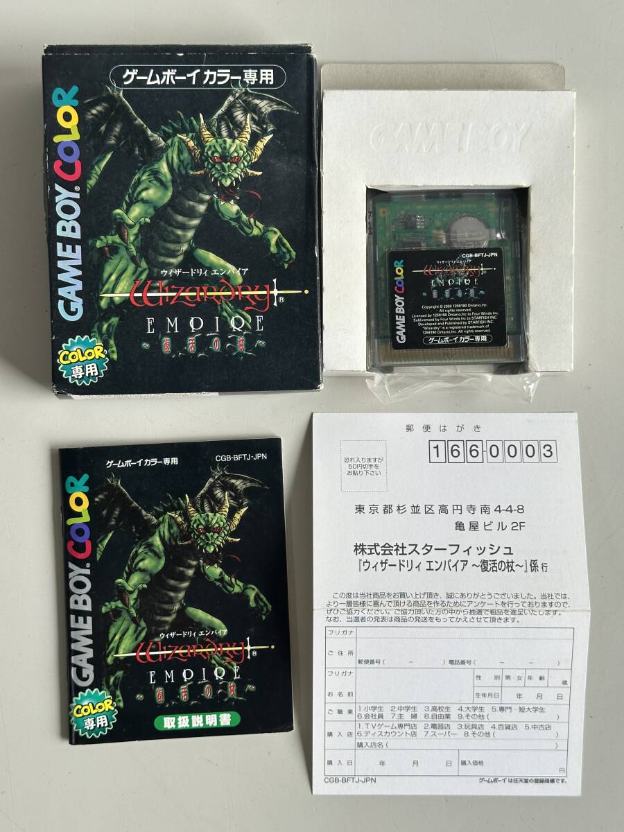 WIZARDRY EMPIRE ゲームボーイカラー ウィザードリィ エンパイア 復活の杖 GBC ハガキ付き 送料185円 写真にあるのが商品すべてとなります。 *その他の付属品はございません。 ◆商品状態◆ こちらの商品は代理出品となります。 動作良好です。現状で使用いただけます。 初期不良があった場合は返金にて対応いたします。 商品の返送→確認→返金という流れになります。 現状使用できていても、保管中、輸送中に故障する可能性はございます。 上記内容でご了承の上入札ください。 パッケージに傷、汚れがある場合がございます。 ご了承の上入札ください。 商品は1点物につき返品、交換できませんので、ご理解の上入札ください。 以上ノークレームでお願いします。 *記載内容と異なる場合はご連絡ください。 | ||||