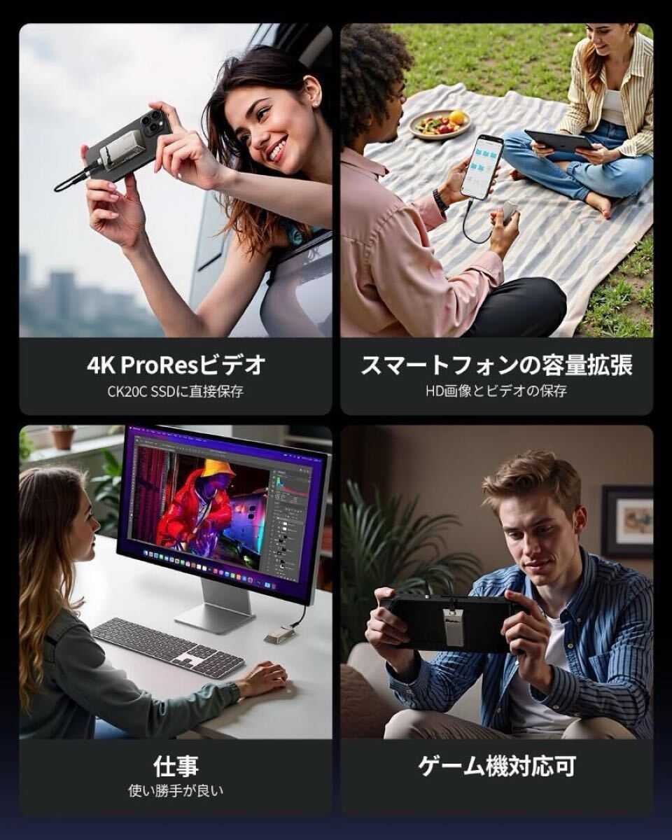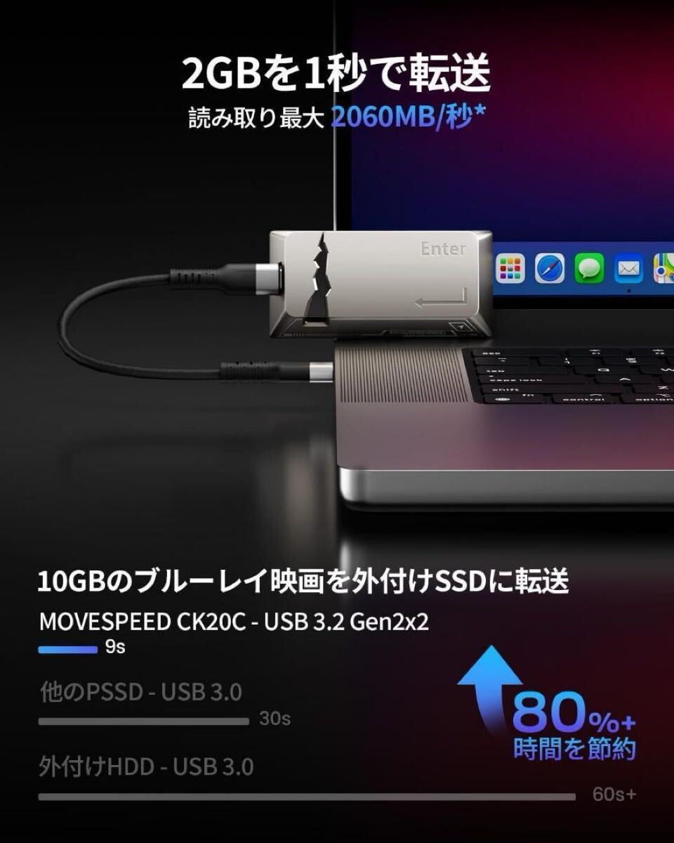 【2060MB/秒で写真や4K動画を高速転送】MOVE SPEED 2TB SSD 外付けは、最大2060MB/秒の読み込み、1800MB/秒の書き込み速度を実現するUSB3.2 Gen2x2を採用。USB3.2 Gen2の2倍、従来のSSDと比べ20倍の高速転送を実現し、2GBの4K UHDビデオファイルをわずか1秒で転送可能。ゲームのロードやファイルの転送を驚くほど迅速にし、CK20Cポータブル2TB SSDはプロジェクト作業に理想的な選択です