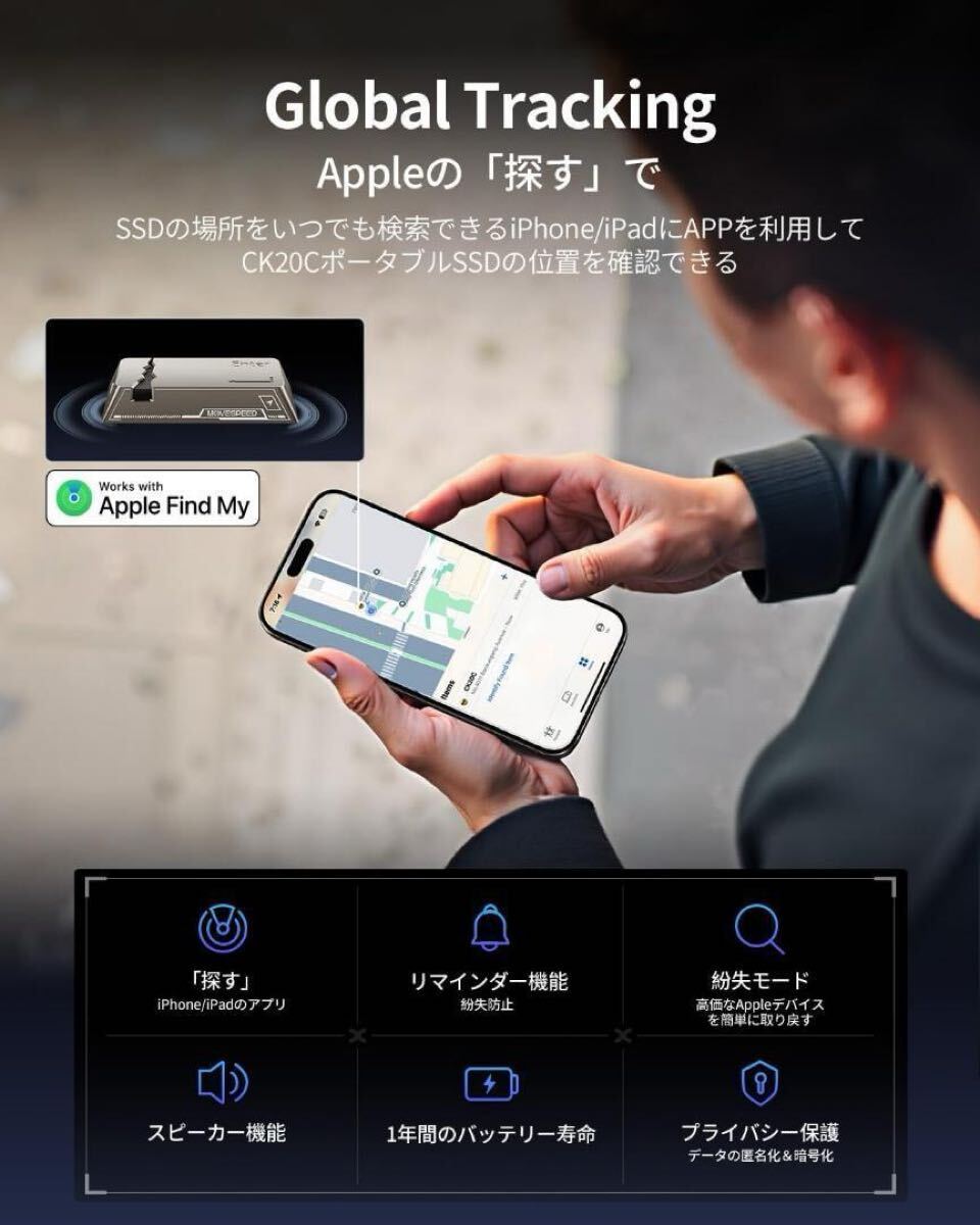【紛失防止、データ安心】高価なSSDの紛失や重要なデータの漏洩を心配していますか?iPhoneの「找」アプリ対応、世界初のGPS内蔵するの外付けSSD-CK20C登場!Global Trackingが内蔵されており、iPhone/iPadの「找」アプリに接続し、SSDの場所を知ります。カフェや会議室に置き忘れたり、旅先で紛失したりする心配しません。