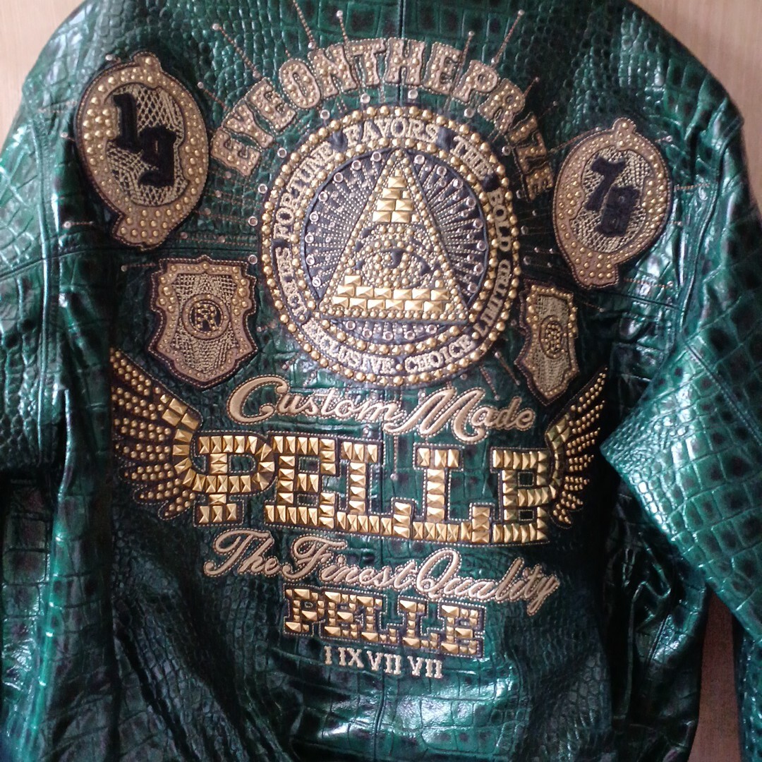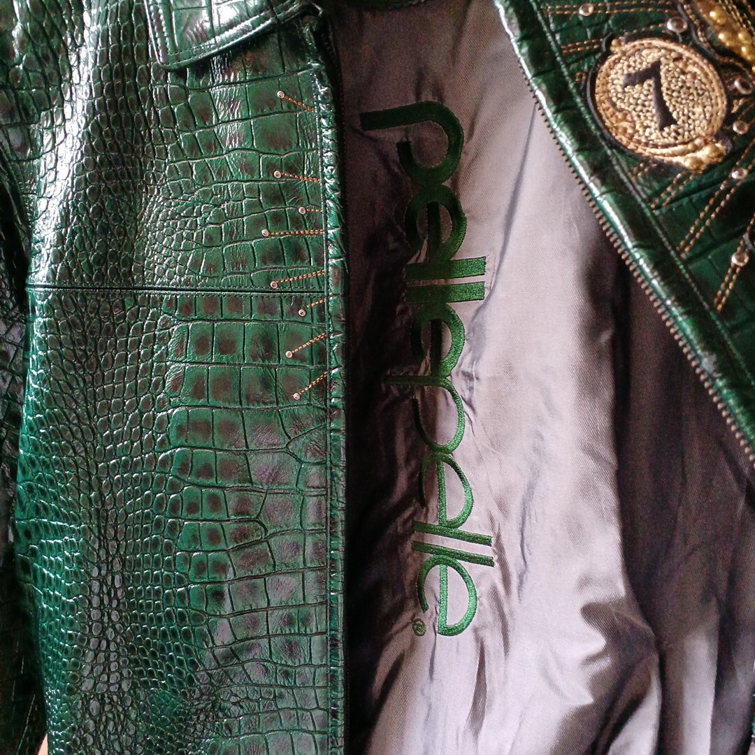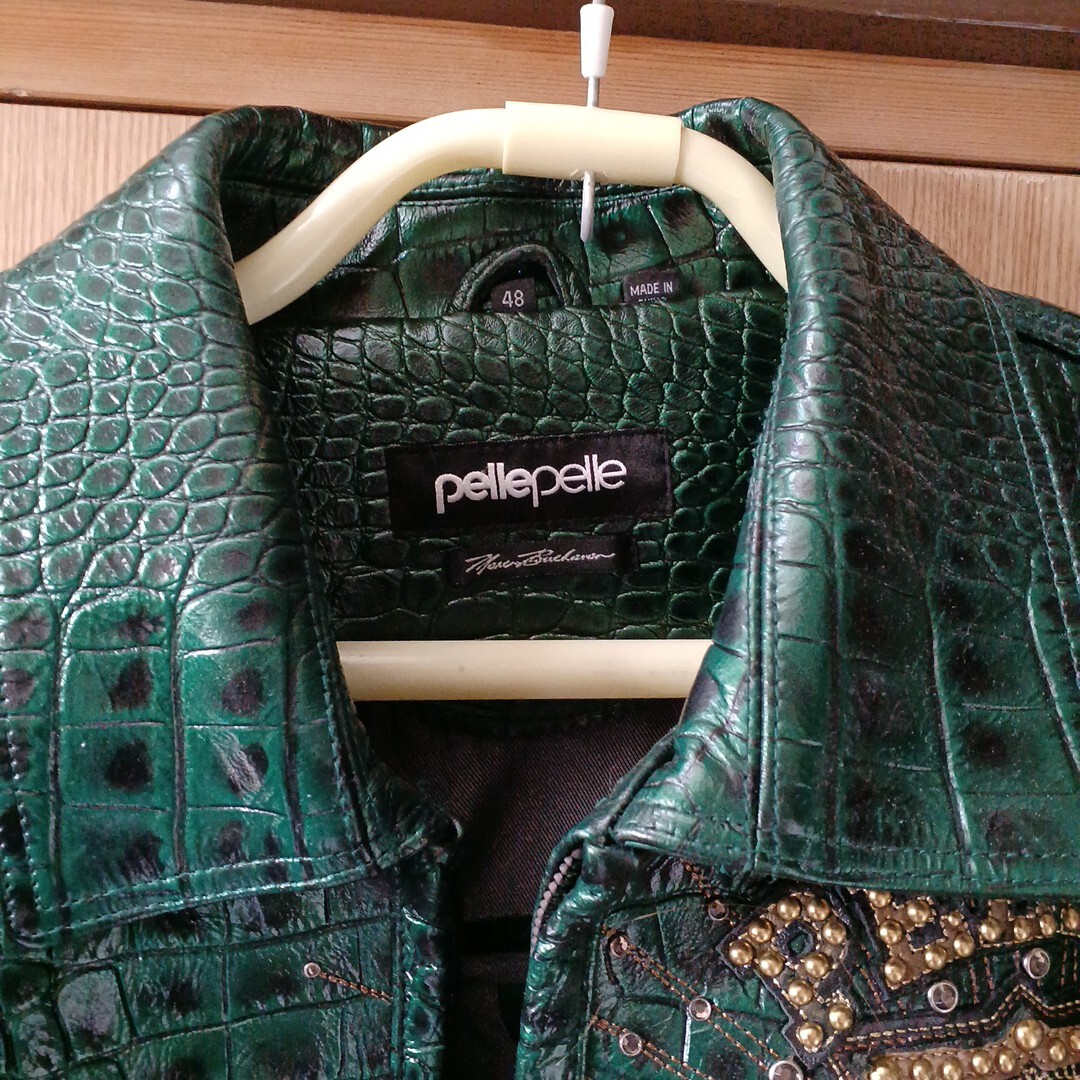 ペレペレ レザージャケット サイズ48 新品で購入して数回着ただけなので特にダメージはなくキレイな状態です グリーンのクロコ調でスタッズが派手でインパクトがあります 袖丈50cm(脇下から手首まで) 身幅60cm(脇下で計測) 着丈70cm