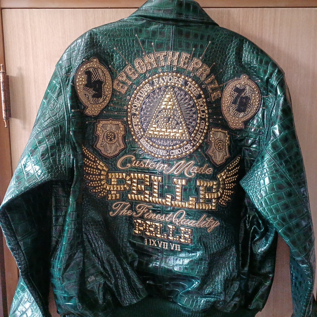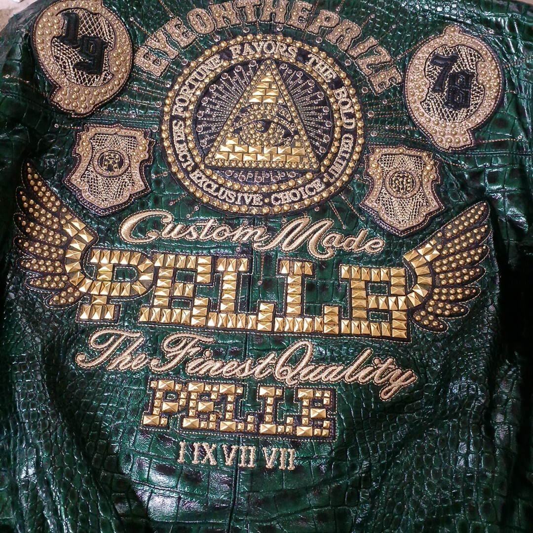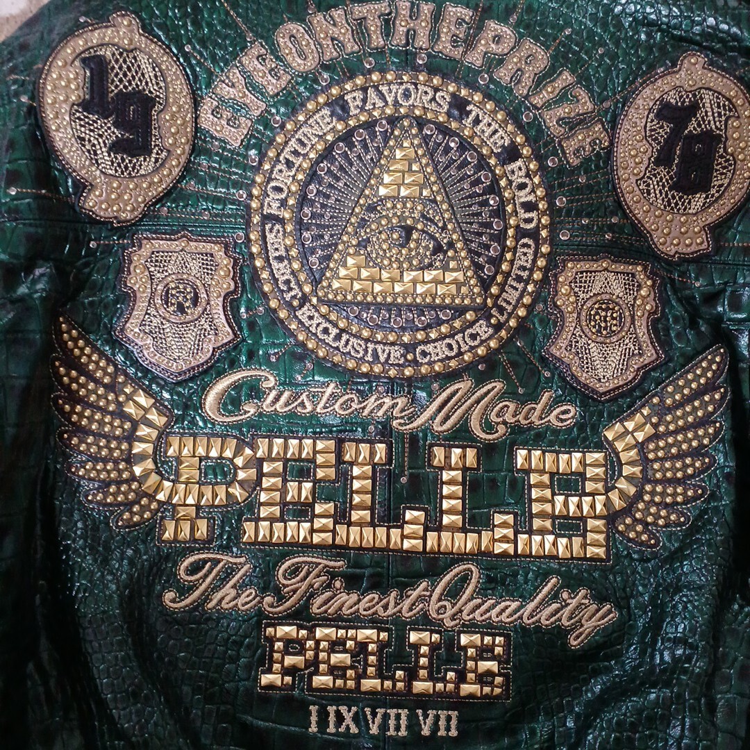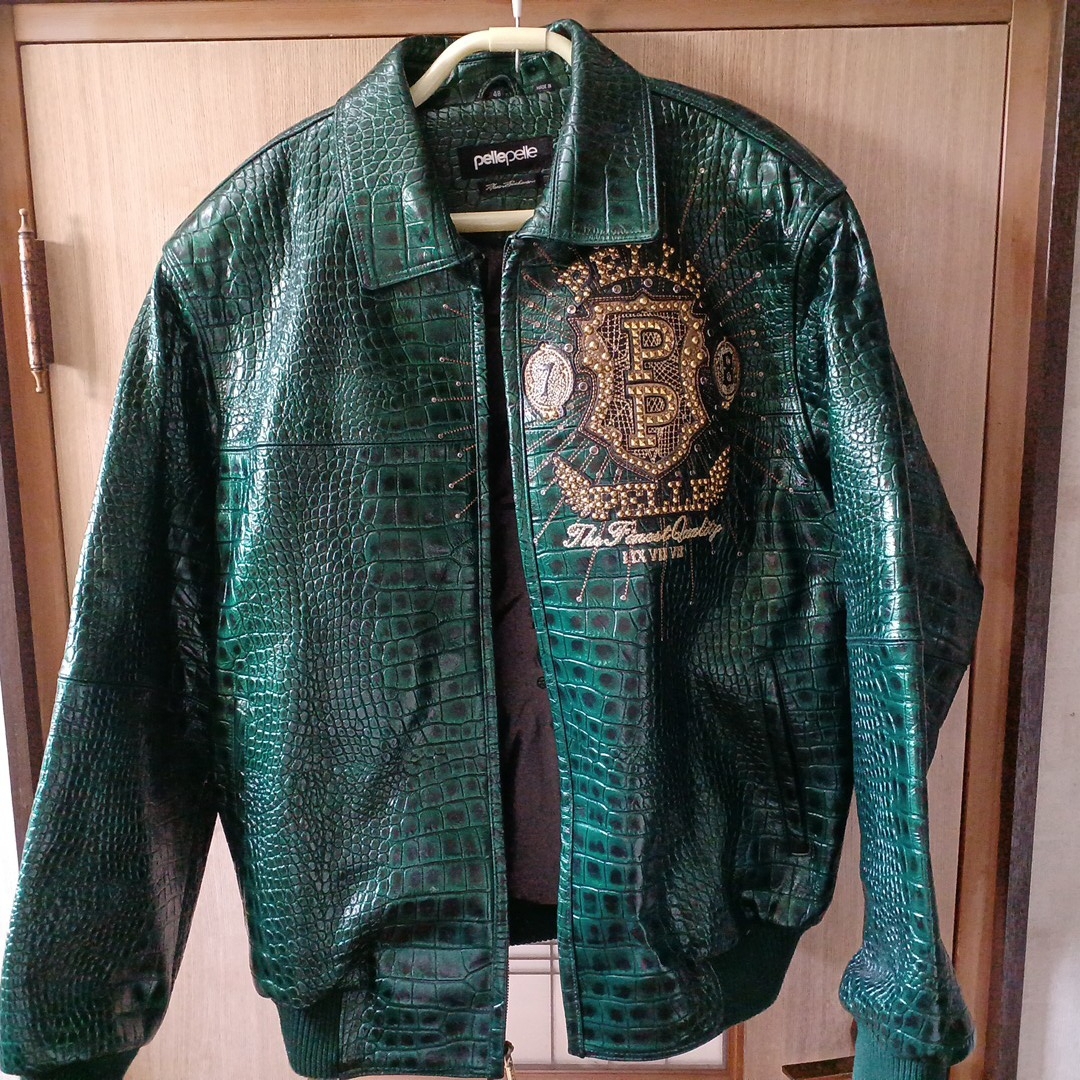 ペレペレ レザージャケット サイズ48 新品で購入して数回着ただけなので特にダメージはなくキレイな状態です グリーンのクロコ調でスタッズが派手でインパクトがあります 袖丈50cm(脇下から手首まで) 身幅60cm(脇下で計測) 着丈70cm