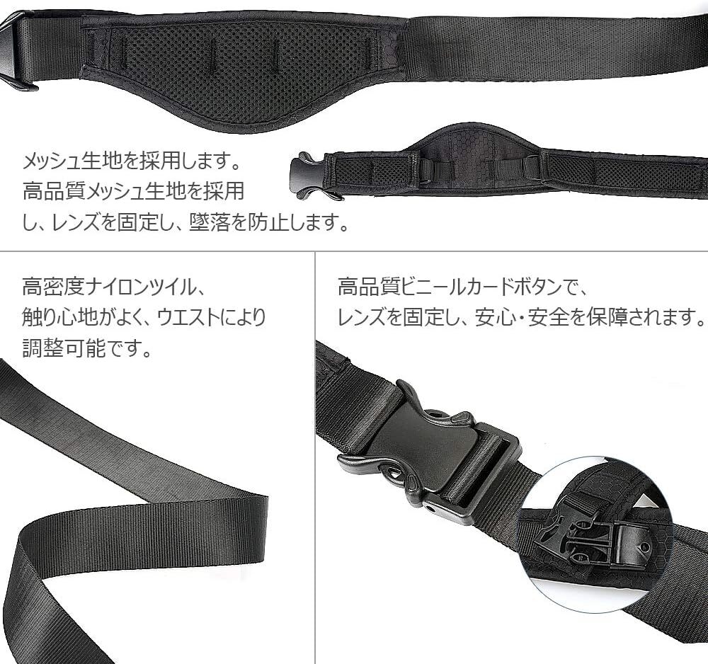最後に、ベルトのサイズ調整が可能なので、ウエストやレンズのサイズによらず、カメラ本体とレンズをしっかりと固定できます。安全かつ安心して撮影を楽しむことが可能となります。