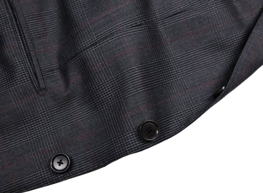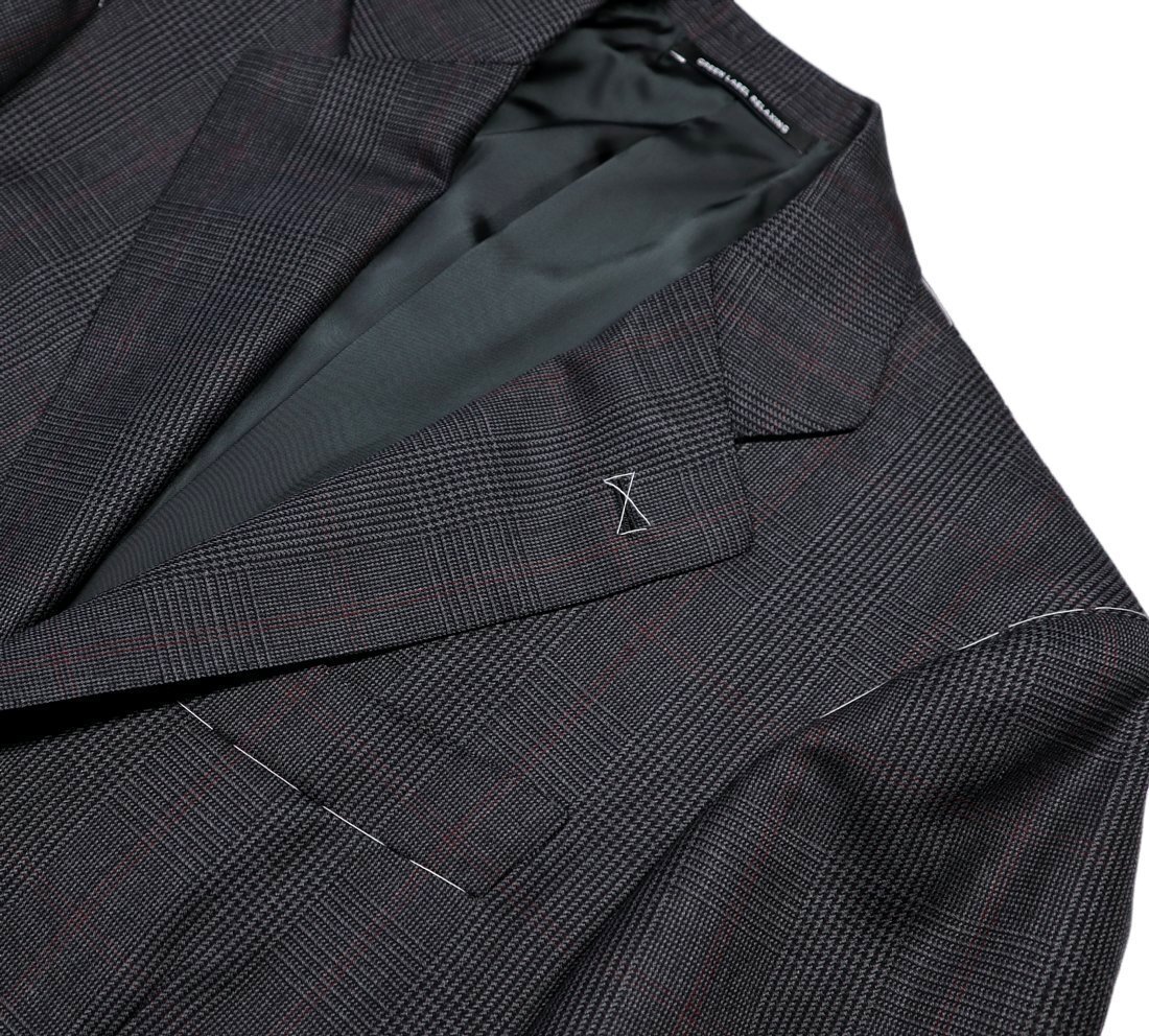 シングルブレスト段返り3ボタン 袖4ボタン(未修理) 胸・バルカポケット 腰・玉縁ポケット D管留め 大見返し仕上げ 内ポケット3つ(松葉カンヌキ仕上げ) 汗止め付き 額縁仕上げ ハンガーループ 本ナットボタン 襟裏ヒゲ付き 生地タグ 総裏 サイドベンツ