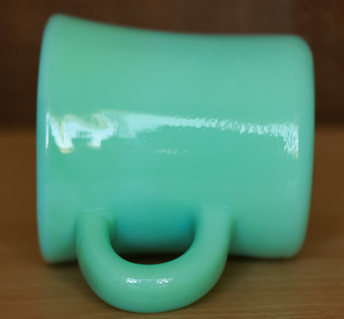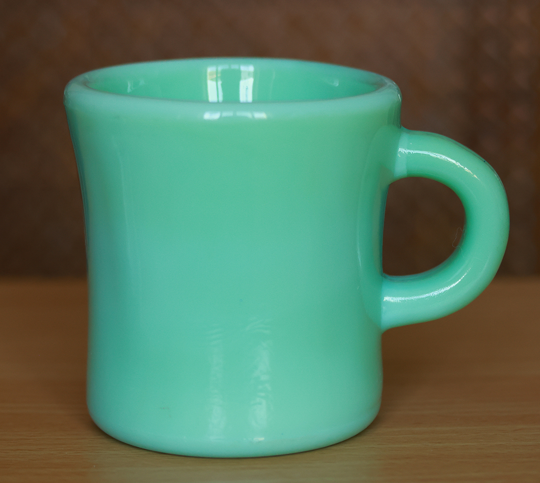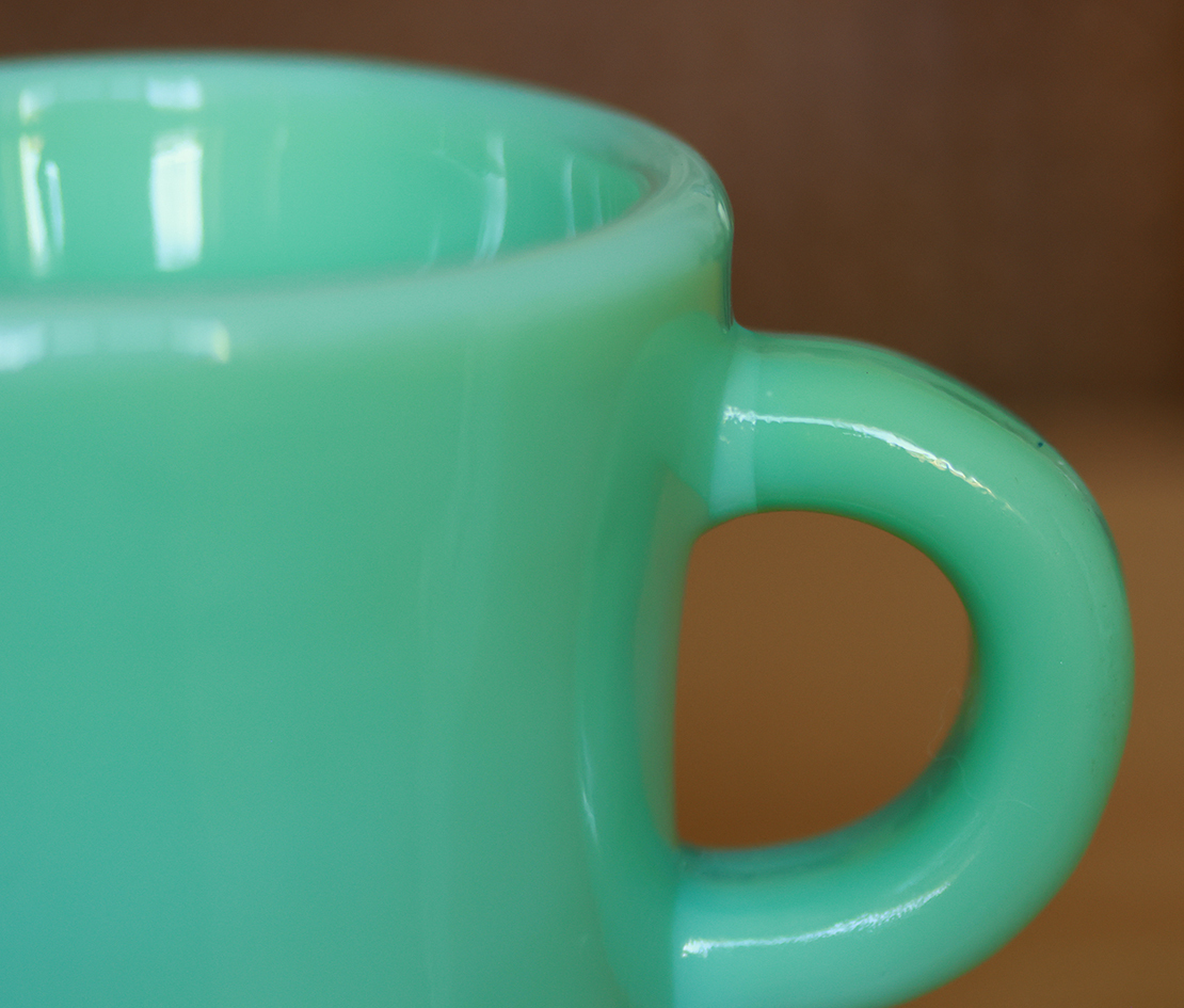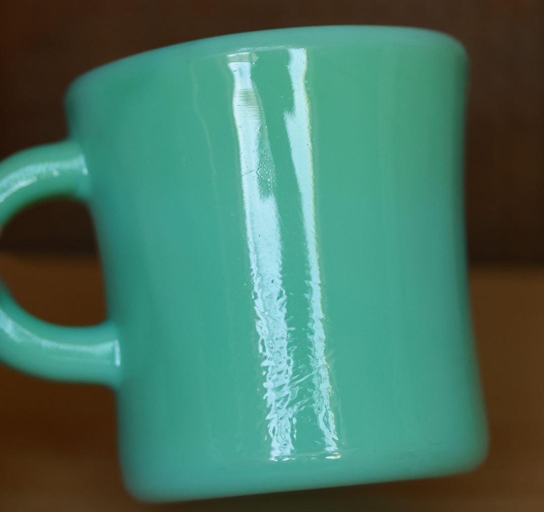 【商品の状態】 ★★★★★★ 製造年:1950年代 口径7cm 高さ8.8cm 重さ450g とても状態の良いオリジナルファイヤーキングのジェダイレストランウェアのエキストラヘビーマグです。 ヒビ、カケなく、ツヤがあり、使用感もなくミントコンディションです。リムのざらつきもなくとても艶やかで綺麗な状態です。 ハンドル上部にジェダイの色がやや違いますが、製造時にガラスを型に流し込んだ際にできるものです。 底にはファイヤーキングの刻印があります。 60サイズでの発送となります。送料は料金表をご確認くださいませ。L219-13 【送料】