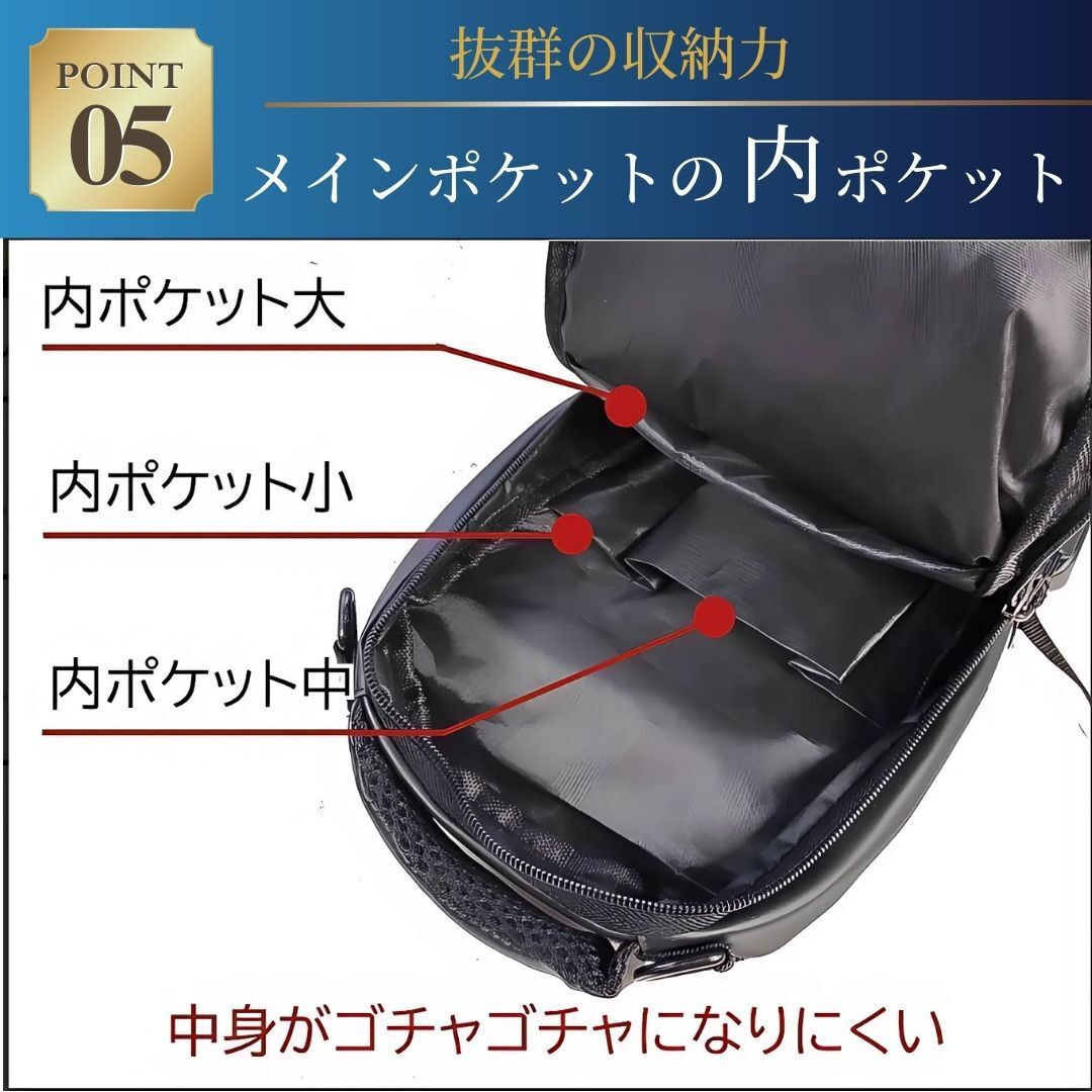 ボディバッグ表面には大口のジッパーが2つに3つのポケット、内側にはこちらも3つの内ポケットを備えて、バッグ内がスッキリ片付いた状態を保てます。