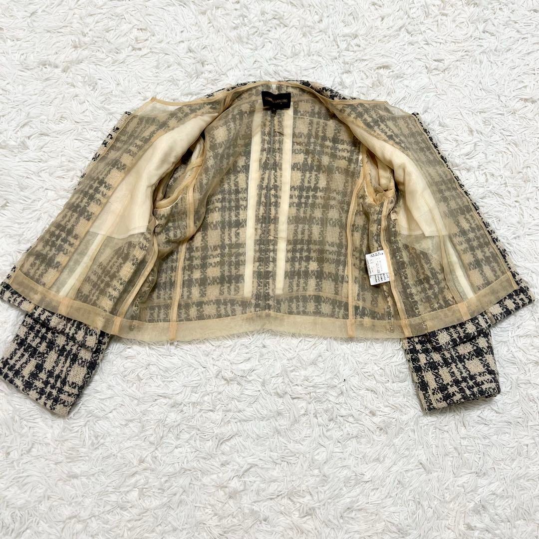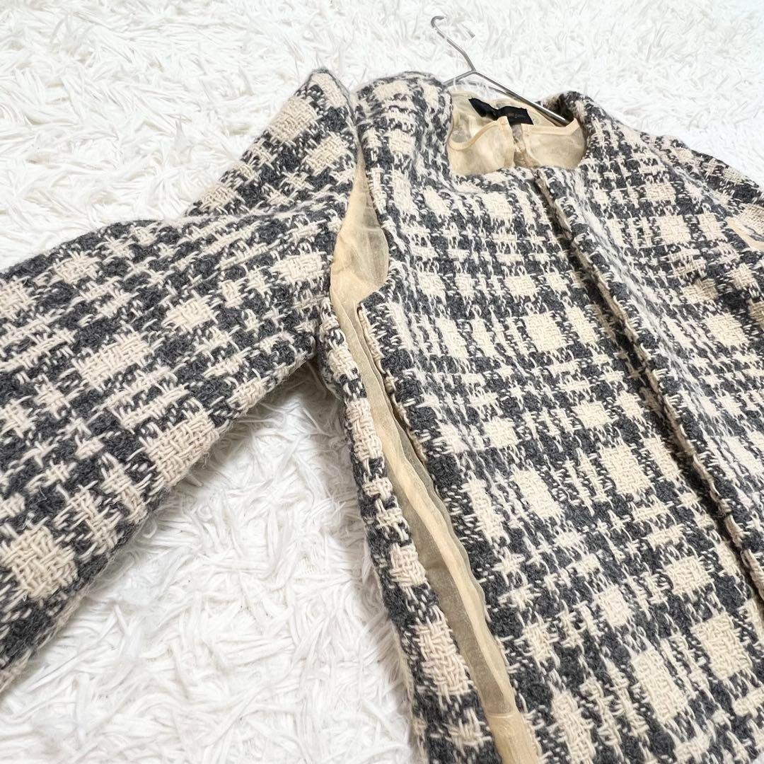 ブラック×ベージュのシックなチェック柄に、裾や袖口に透け感のある裏地をあしらった独特のデザインが魅力的な一着。