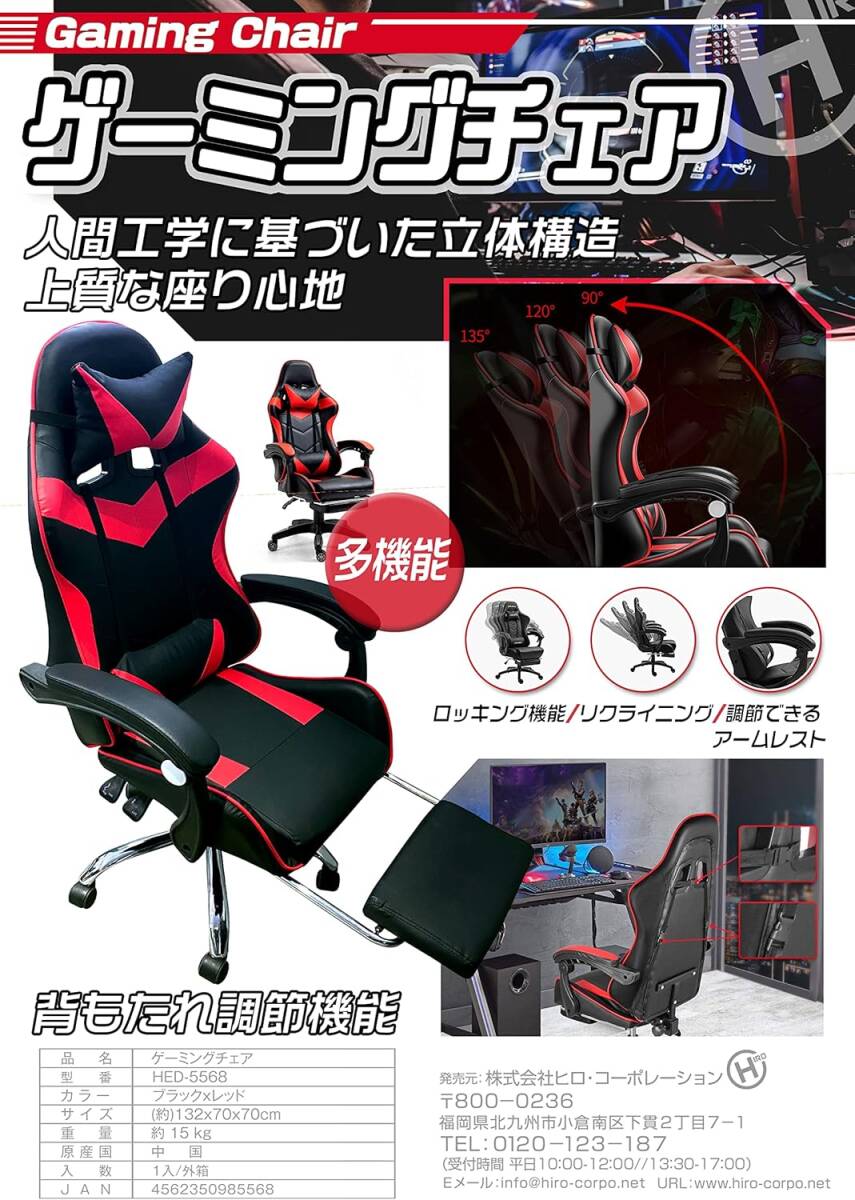 【HIRO】 ゲーミングチェア HED-5568 ブラック
