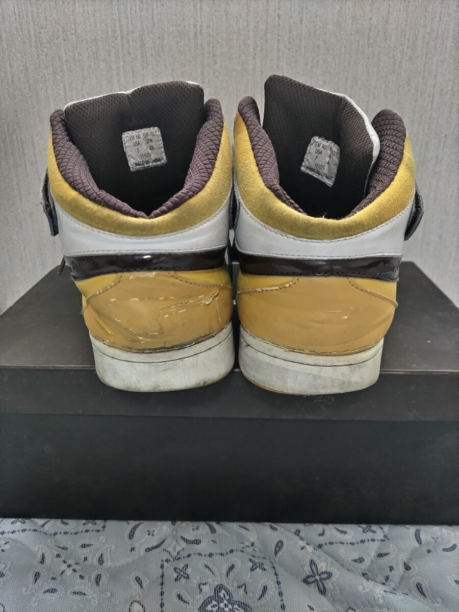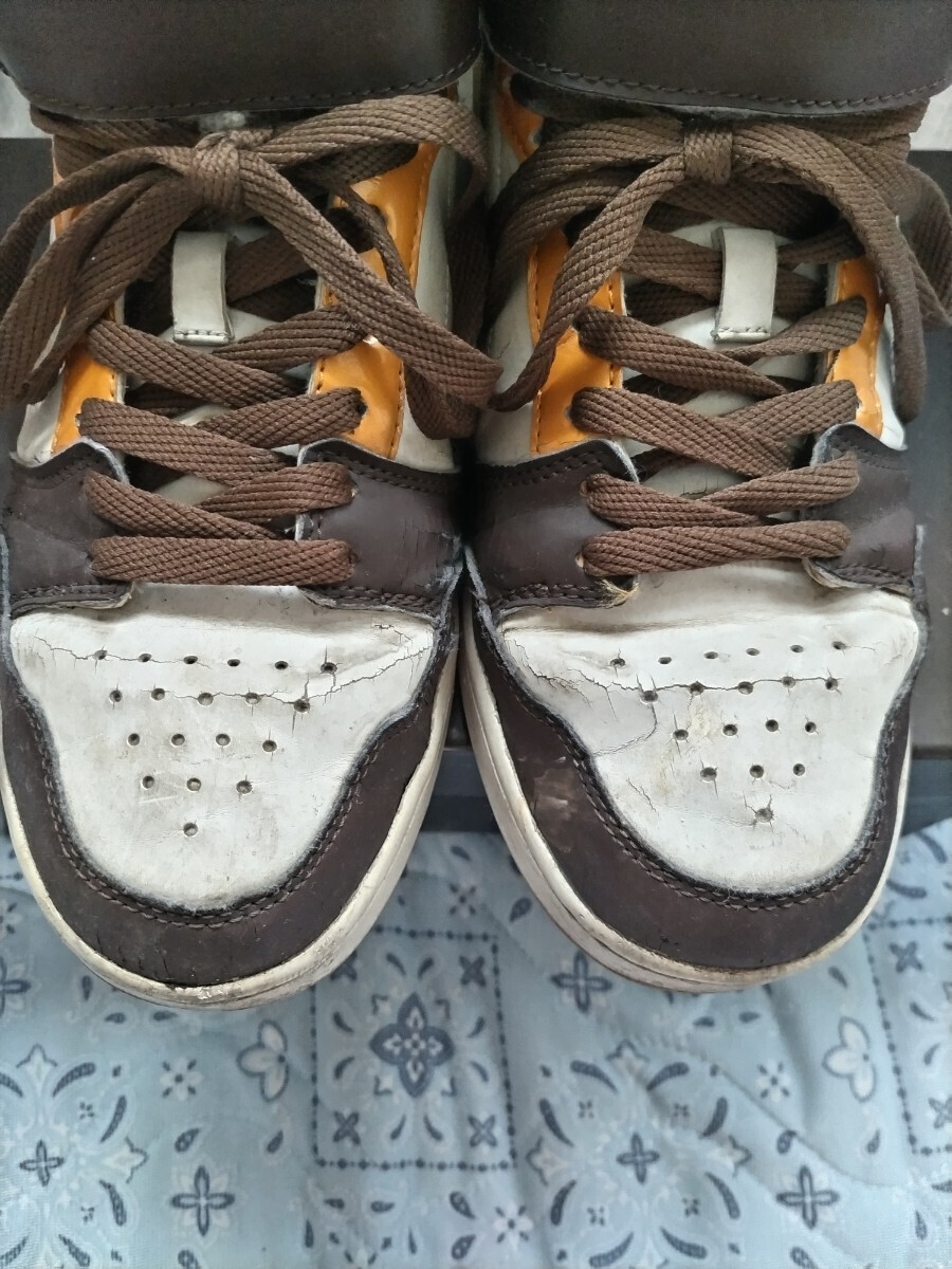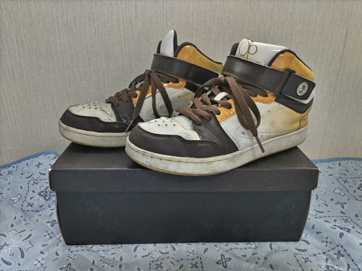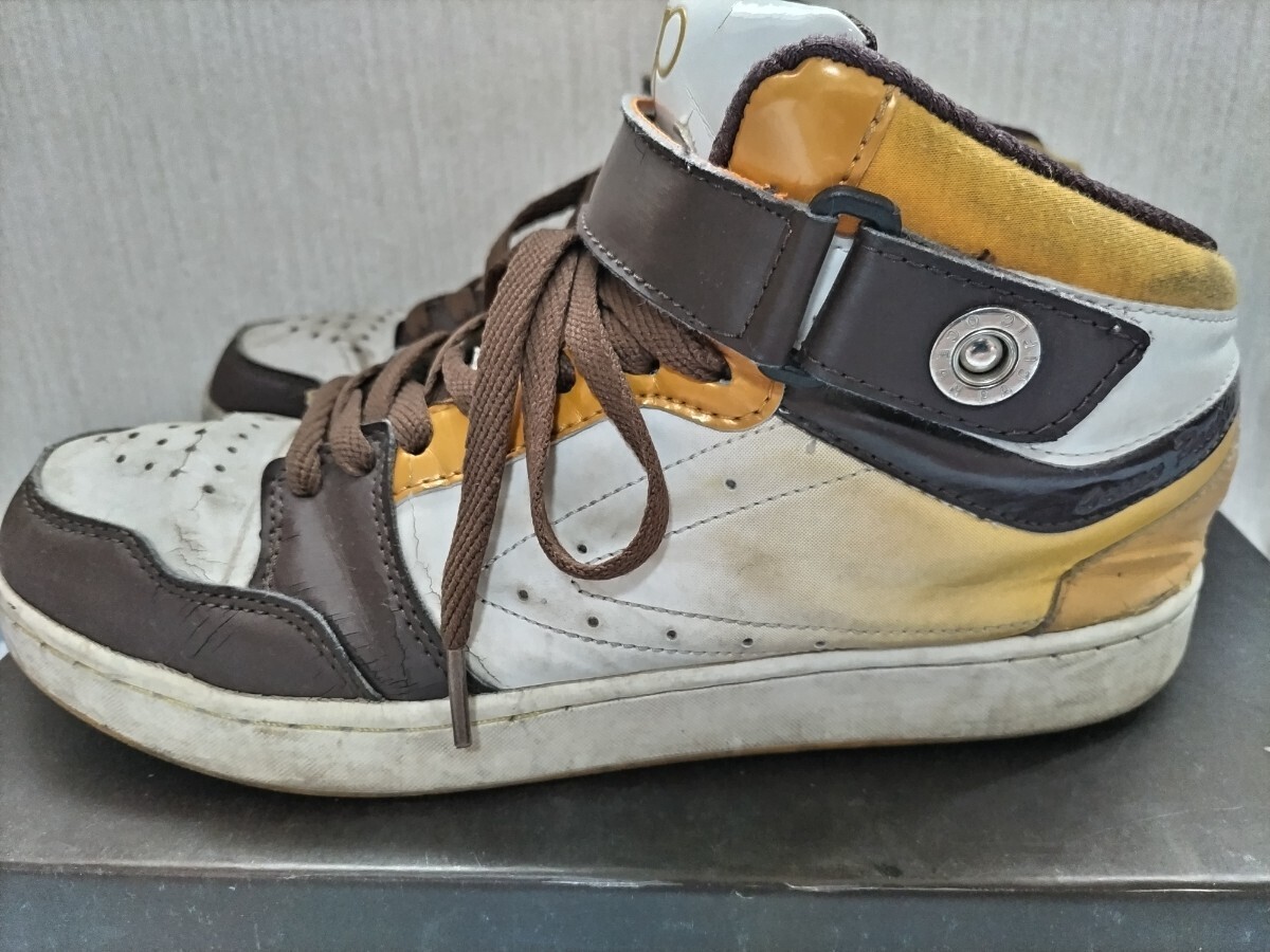 ブラウンとホワイトのハイカットスニーカー、ベルクロストラップ付きでスタイリッシュ。