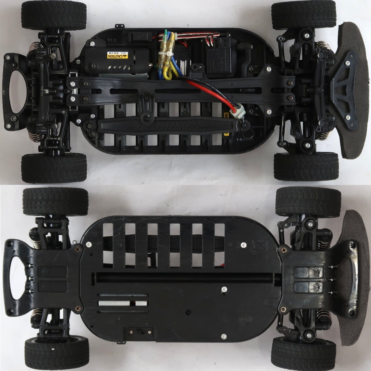出品は画像の物が全てです。バッテリー、充電器とプロポ用の電池があればすぐに使用は可能です。使用品ですし所々に擦れや汚れがあります。ボディは擦り傷汚れがあり、何箇所か割れている箇所があります。フロントエアダクトとフロントナンバープレート周り、それとリアのマフラー周りに割れている箇所があります。フロントナンバープレートがないです。右リアライトがないです。シャーシは特にひどいダメージはないです。この状態でテストをしましたが操作はできましたし、動作はしました。分かる事は以上です。お取引後は一切のサポートはしておりませんので問題があればご自分でご対処ください。お取り引き後に説明以外の不足品や説明以外の破損や故障が有ったとしても返品は出来ませんしクレームもお受けできません。問題があれば全てご自分でご対処ください。