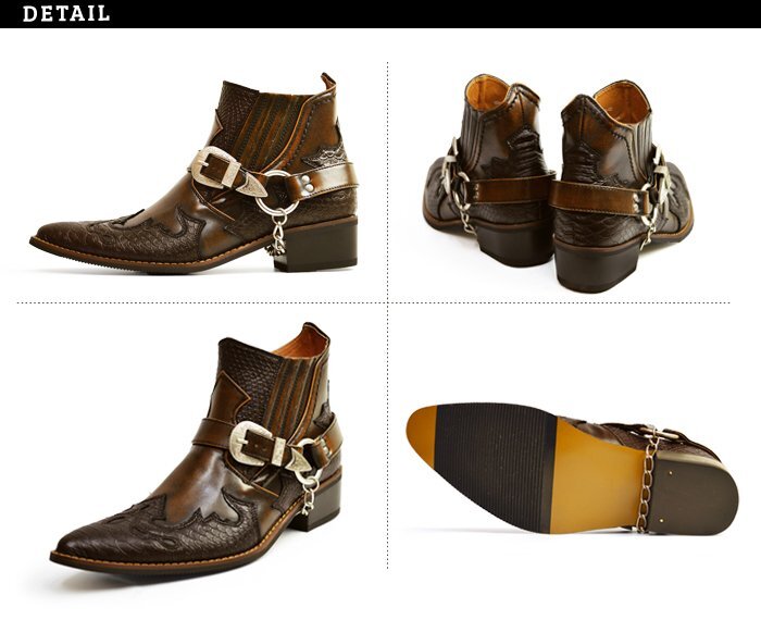 メンズ ウエスタンブーツ 脚長 ヒールアップ サイドゴア サイドジッパー ヘビ柄 パイソン バックル リングブーツ 男 靴 ze6001