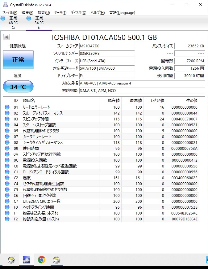 ・当方の環境でCystalDiskInfoを使用し正常判定でした。