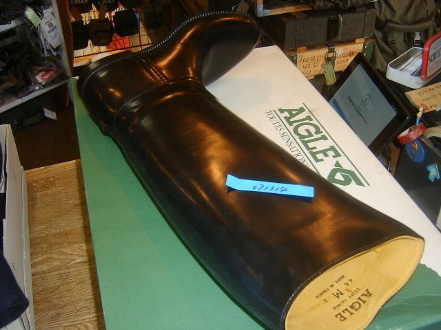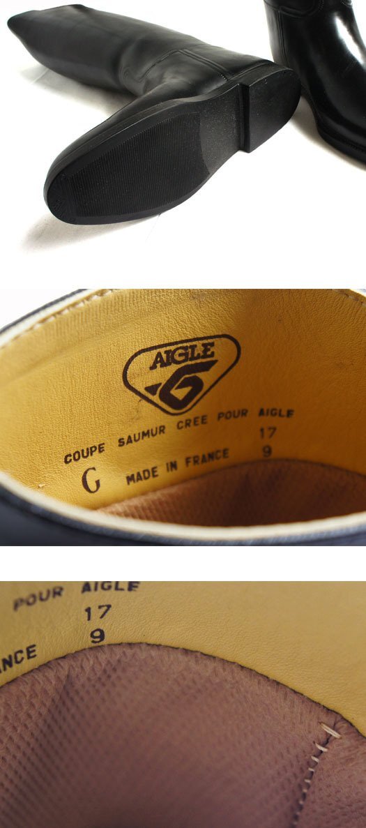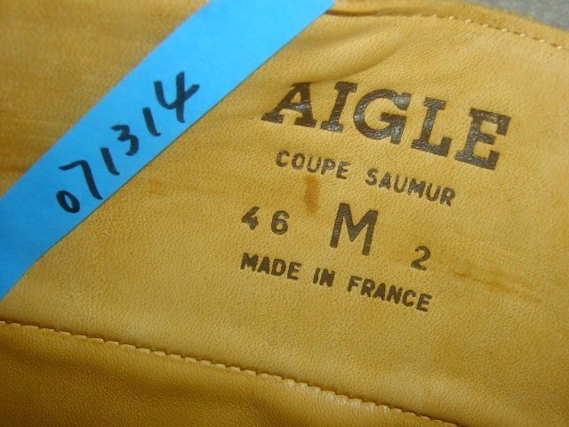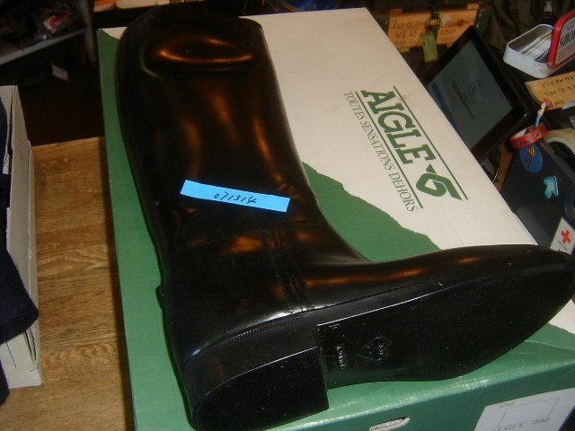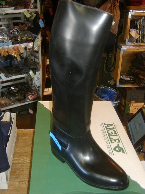 「フランスが誇るアウトドアブランドAIGLE社製のラバーブーツです。160年の歴史を持つAIGLE社は、フランス軍にラバーブーツやスニーカーを納入しています。こちらのブーツはフランス軍 乗馬部隊に納品されていたもので、雨や泥汚れに強いラバーが使用されています。内側には一部レザーが使用されており、高級感が漂うブーツですので、レインブーツとしては勿論、普段履きにもおすすめです。」 サイズ39で23.5cm相当です(アウトソールで27センチ)、しかしふくらはぎは日本人には細めの37cm程度ですのでご注意ください。高さは膝までの43cm程度です。未使用ですがブーツの表面はこすれなどによる曇りがありますことご了承ください。 沖縄離島を除く全国500円にて元払いいたします。落札価格にプラスでお願いいたします。。