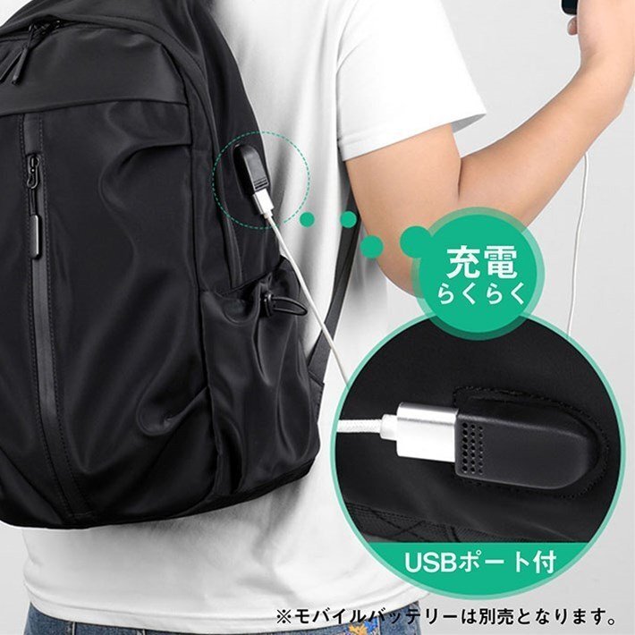 バッグの外側にはUSBポートを装備。内部のUSBケーブルとお手持ちのモバイルバッテリーを予め繋いでおけば