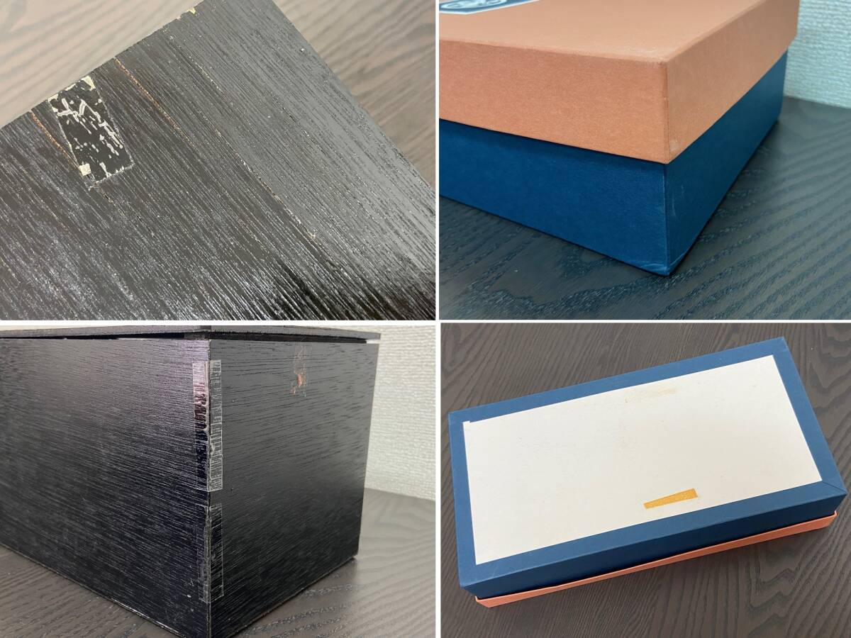 有田焼の黒い木箱は蓋にヒビ割れ、木箱の角にテープで補修がございます。