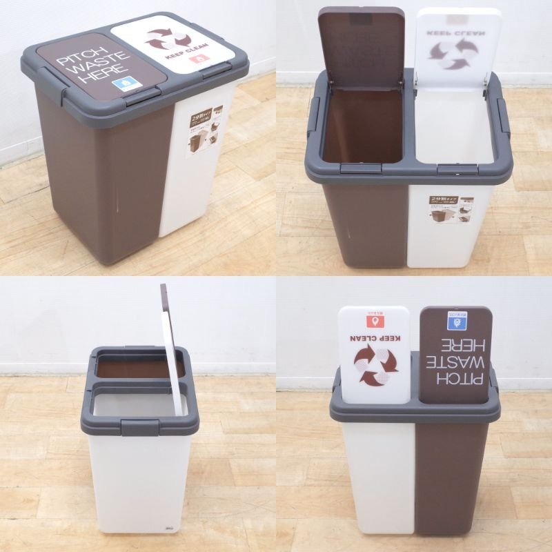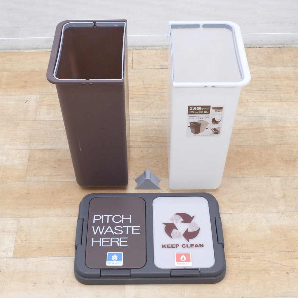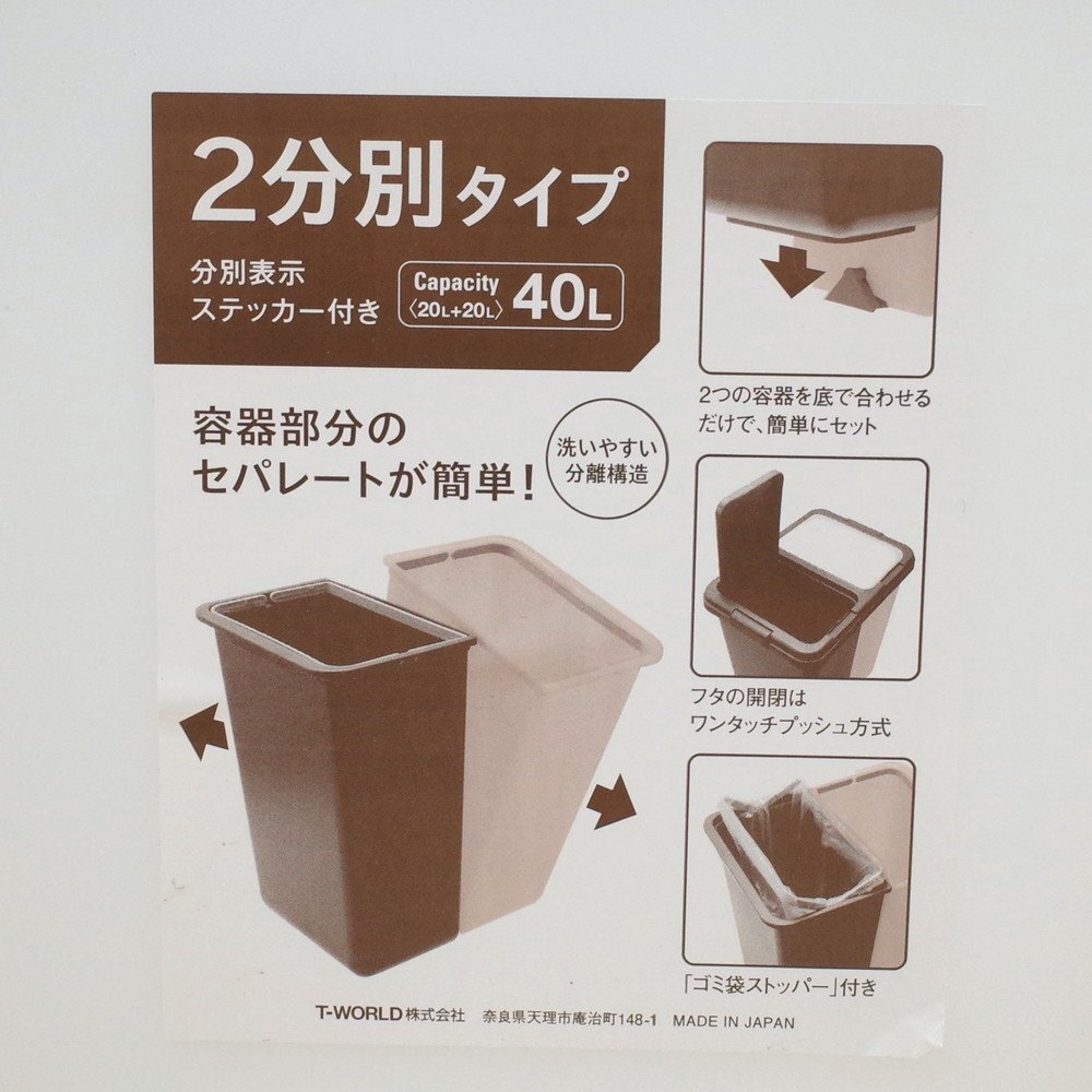 T-WORLDの2分別タイプのゴミ箱です。 20L20Lで合計40L! ご家庭用や小規模オフィスにちょうどいいサイズ感! 蓋と連結器具を外せば分解もでき、ゴミ出し時に分別する手間が省けて便利です。 カジュアルなデザインで目立ちすぎないのもポイントです。 ぜひ、古くなったゴミ箱と入れ替えなどいかがでしょうか? |