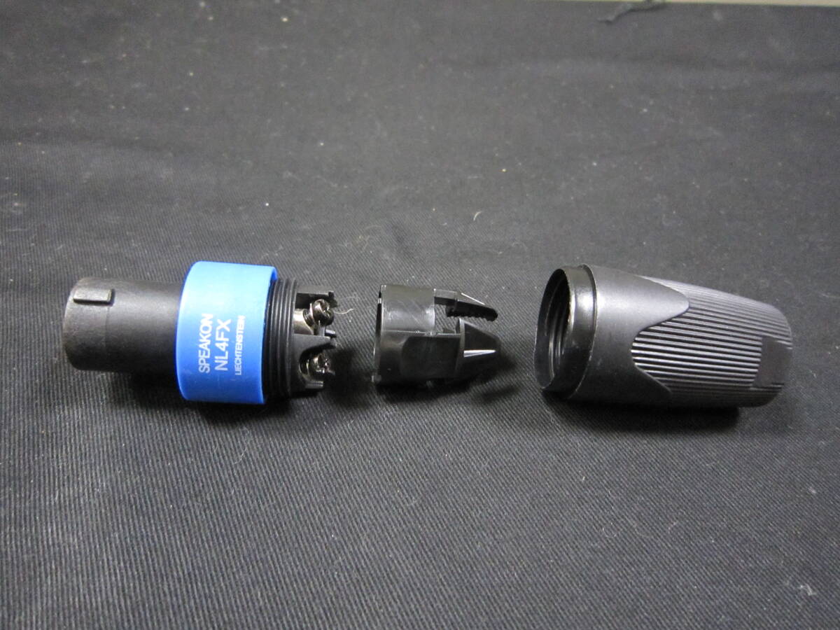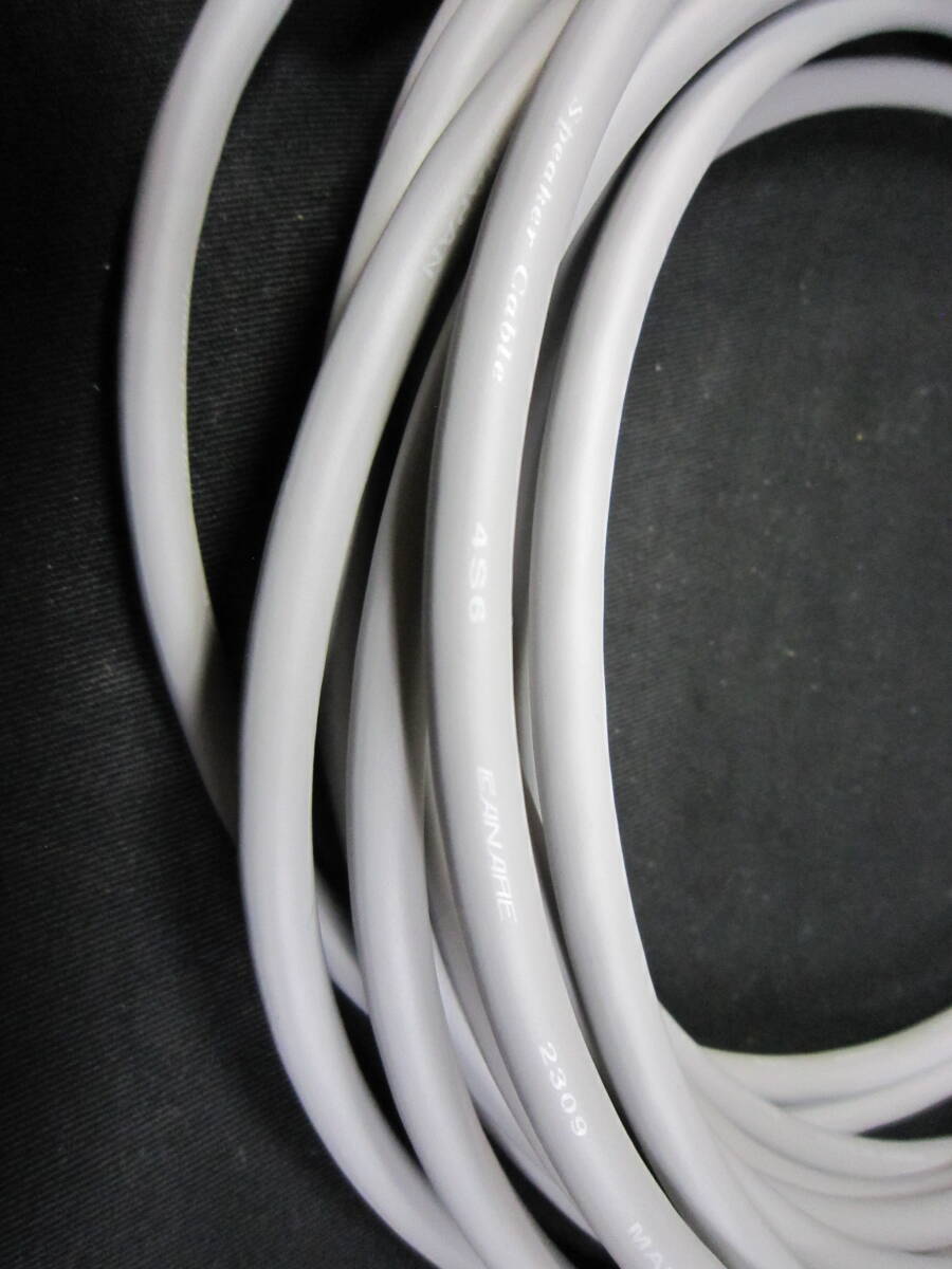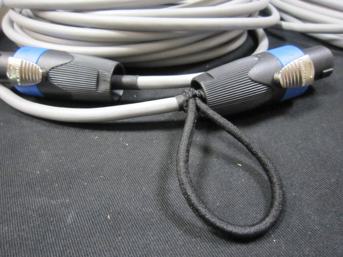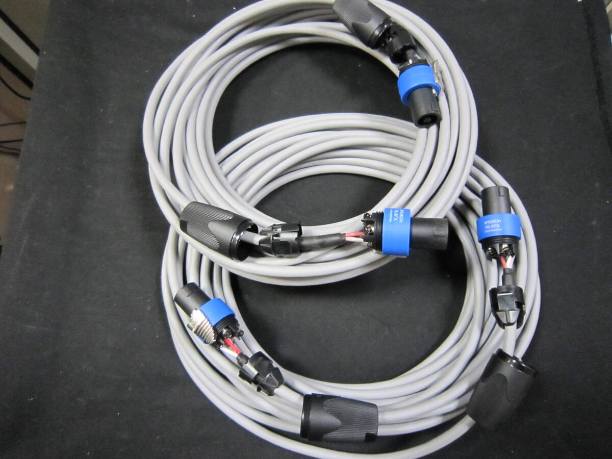 ご覧いただきありがとうございます。CANAREスピーカーケーブル 4S6灰色、スピコンコピー品プラグを使って製作したスピーカーケーブル10m2本1組です。NEUTRIK NL4FXとの表記がありますがノイトリックでは無いと思います。端子ネジの精度など、純正品との違いは特に見つけられませんでした。コネクタのロックも確実に止まります。ロックした後プラグを左右に動かしても切れることはありません。端子部分は通常の+ドライバーではなくポジドライバーできっちり締め付けてあります。結線は1のプラスマイナスの仕様で通常のフルレンジのスピーカーに対応です。ケーブルを巻いて止めるゴム(ヘアゴム市販品)を付けてあります。ゴミなども付きにくく結束バンド(マジックテープ)などより使い勝手は良いかと思います。発送は宅急便送料込みです。どうぞよろしくお願いいたします。
