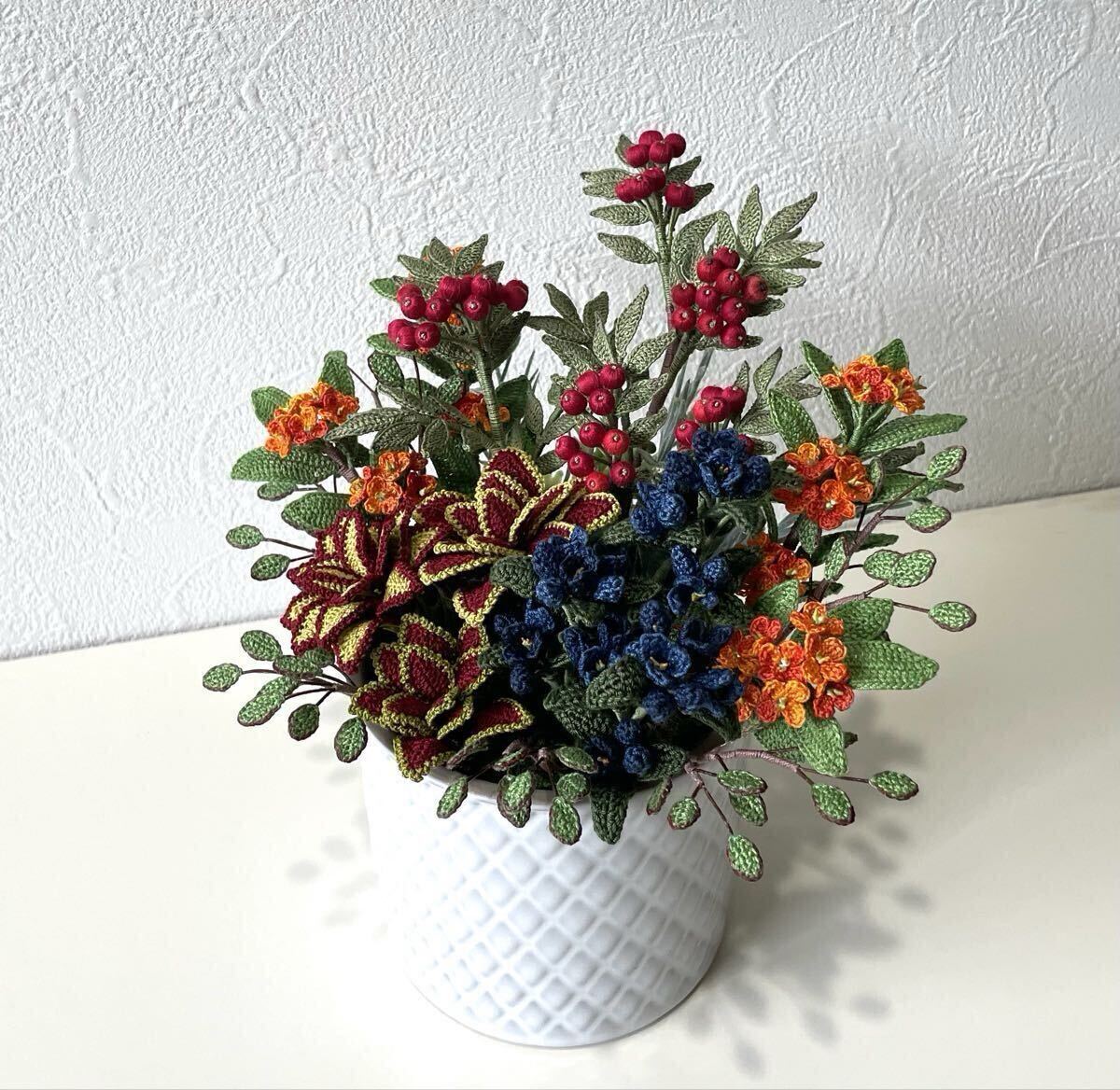 Ako♪・ナナカマド・金木犀・キキョウ・秋色アレンジメント・ハンドメイド・レース編み
