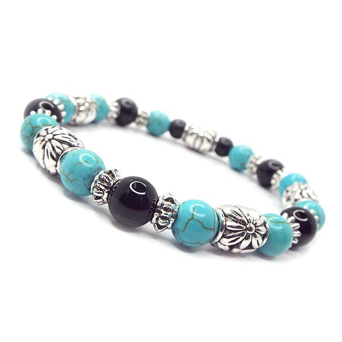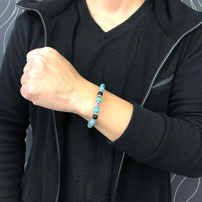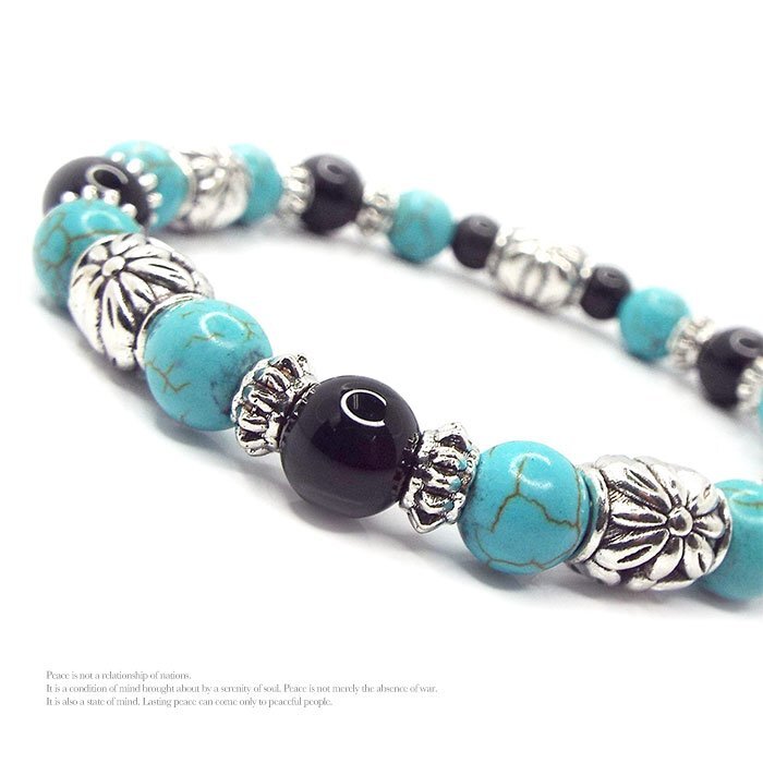 【STONE KITCHEN 天然石 パワーストーン】 ターコイズは、人に贈ったり、贈られることで、パワーを増すといわれ また、旅のお守りとしても知られています。 海外出張や海外旅行へ出かける人へプレゼントすると喜ばれるでしょう!!! 旅行に出かけるときは、アクセサリーで 身につけるのがおすすめです♪ ターコイズとオニキスの組み合わせは災いや事故から身を守る 魔よけのお守りとして強い力を持ち人気がある組み合わせです☆ 内周:約17cm サイズ:ターコイズ(練り) 8mm オニキス 8mm・6mm 1点 注意事項 ※金属部分は汗や汚れ等で変色する場合がございます。気になる場合は金属磨きや布等で軽くふき取る事をおすすめします。 ※石の種類によっては、艶を引き出すことを目的として、ワックスや着色加工がされているものもあります。 ※表示のサイズは必ずしも最大値・最小値のサイズのものが入っているわけではございません。 ※天然石のため同じものでも色味・模様などが異なります。 ※照明の具合で実際とは色合いが異なる場合がございます。 また、天然素材特有のクラック・内包物を有する場合がございます。予めご了承下さい。 | |||