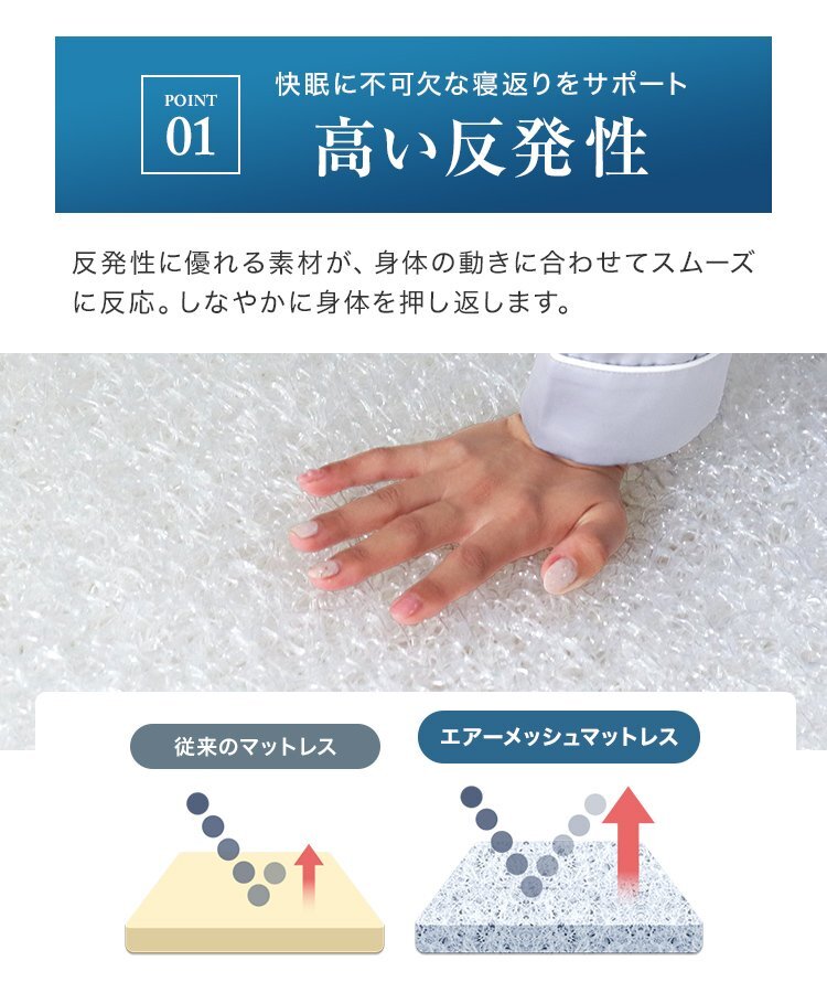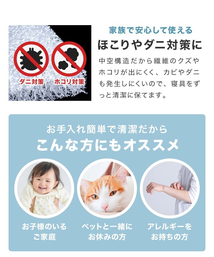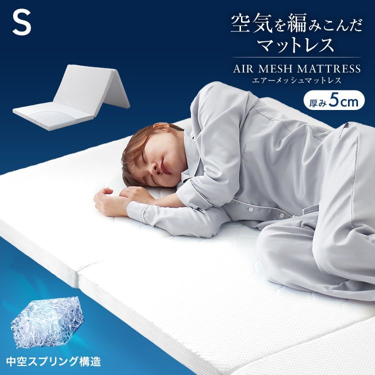 復元力94.8%の3Dエアーメッシュクッションは、身体の沈み込みをあらゆる方向から支えます。 ■ 肩や腰にかかる負担を軽減 ■ 理想的な寝姿勢を実現 ■ 耐久性・通気性抜群 カバーはもちろん、中材まで洗えていつでも清潔に使用できます。 三つ折りだからコンパクトに収納でき、専用の収納袋付きで持ち運びも簡単♪ 【商品詳細】 サイズ:97×195×5cm(シングル) 重量:(約)5.0kg 素材: 側地:ポリエステル100% 中材:中空ポリエチレン樹脂繊維 【注意事項】 《中材:手洗い推奨》 ※洗濯機のご使用はお避けください。 ※中性洗剤と30℃以下のぬるま湯を使用してください。 ※タンブラー乾燥はお避けください。 ※天日干しは避けてください。 風通しの良い日陰で乾かしてください。 《カバー:洗濯機で丸洗いOK(洗濯ネット使用)》 ※タンブラー乾燥はお避けください。 ※ファスナーを閉じて洗濯を行ってください。 ※色移りを避けるため単独洗いを推奨しております。 ※もちろん新品未使用品です 商品コード:FETB001WH ▼検索ワード (マット ベッド ベッドマット トッパー 高反発マットレストッパー 空気を編み込んだ メッシュ 通気性 敷きパッド 布団 寝具 人気 おすすめ WEIMALL) |