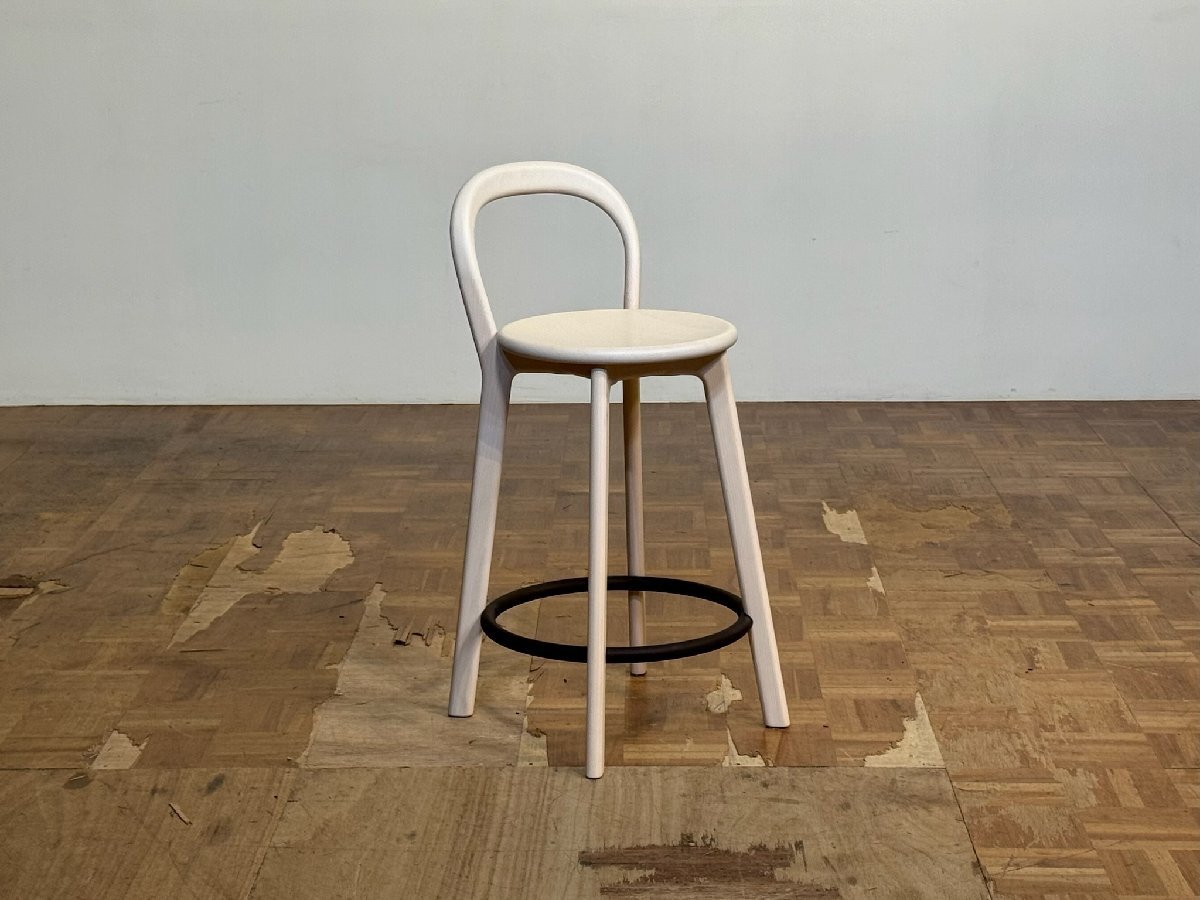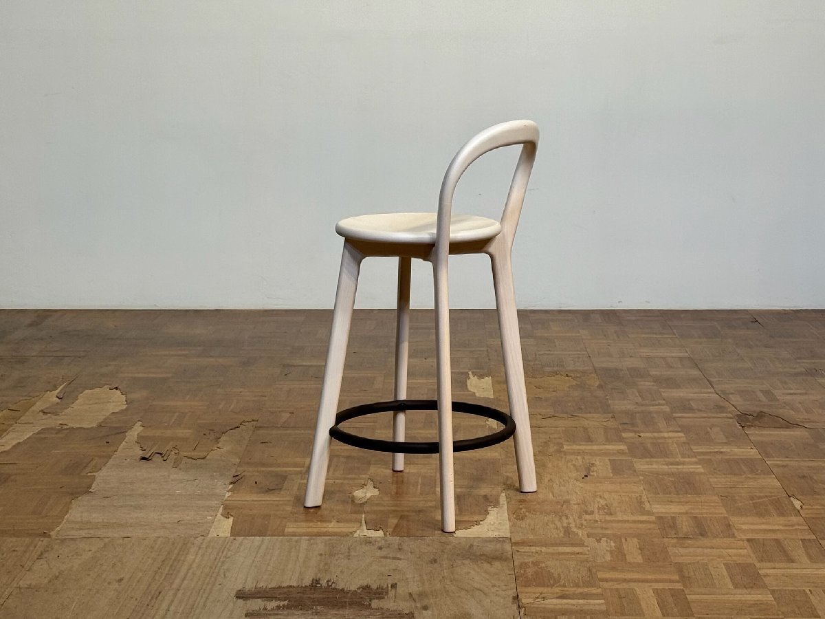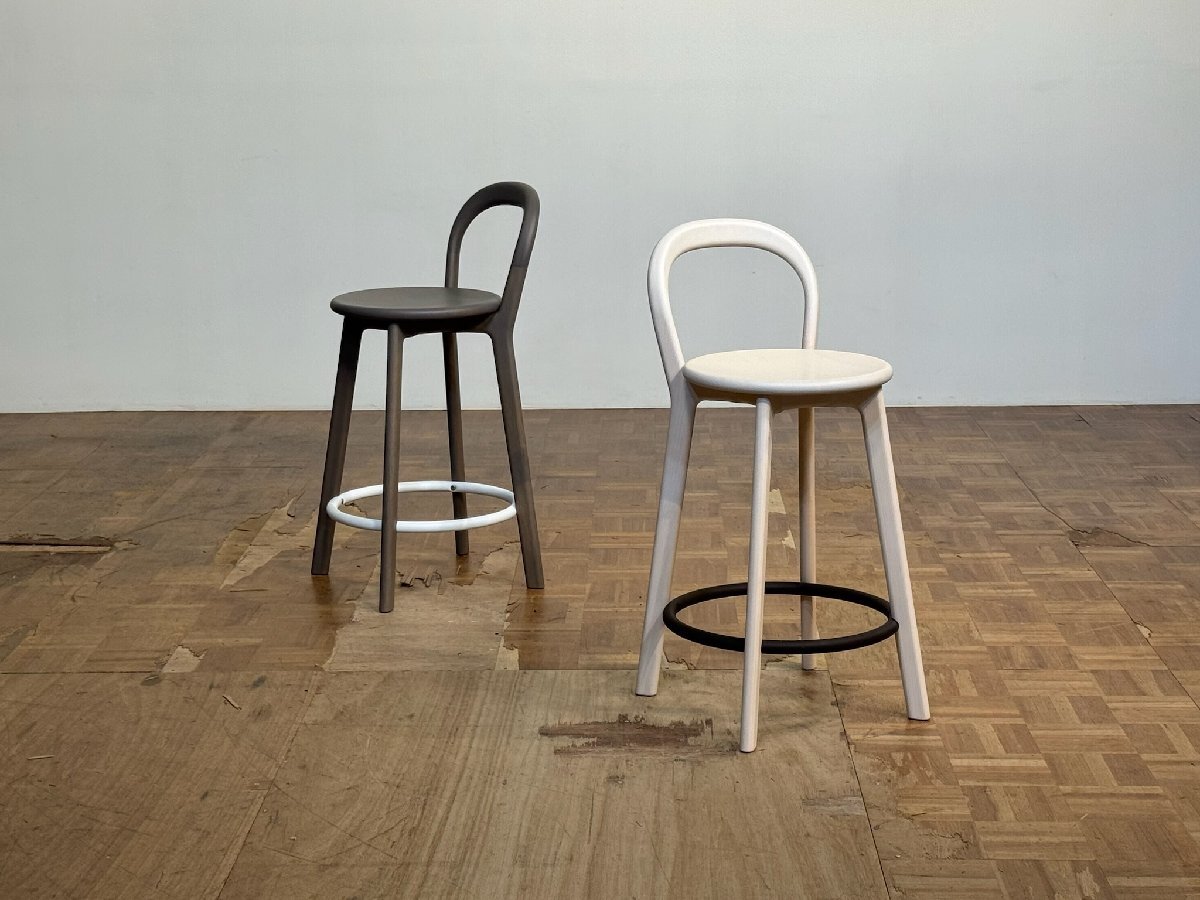 三次元曲面を描くバックレストの芸術的なフレームワークや、熟練のクラフツマンシップによる削り出しのフレーム構成をビビッドに象徴するフットレストの正円のデザインで、ブランドを代表するカウンターチェアとして不動の人気を誇る名作チェア。arflex より。