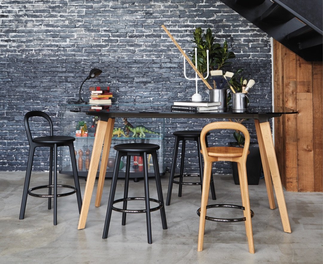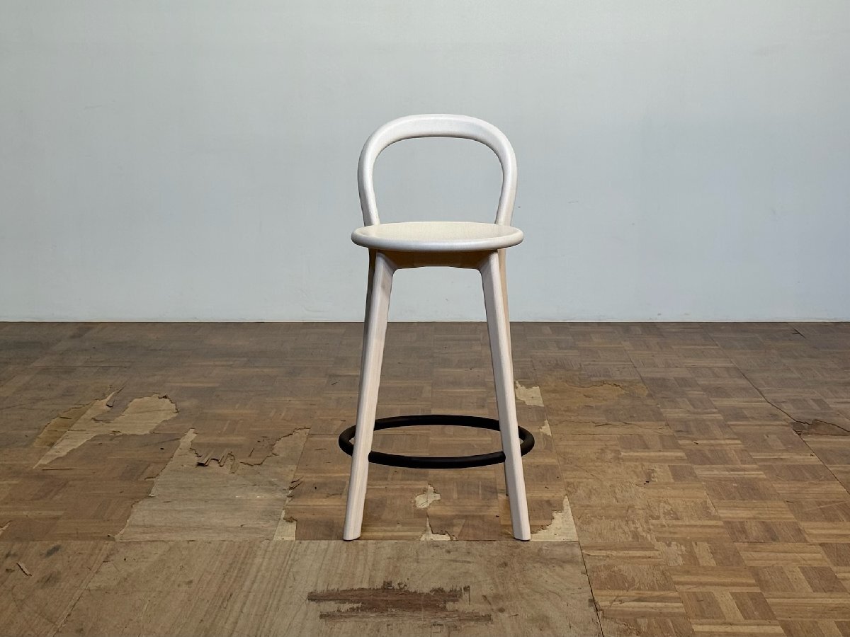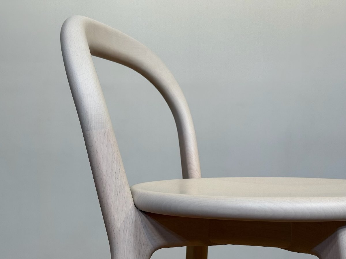 三次元曲面を描くバックレストの芸術的なフレームワークや、熟練のクラフツマンシップによる削り出しのフレーム構成をビビッドに象徴するフットレストの正円のデザインで、ブランドを代表するカウンターチェアとして不動の人気を誇る名作チェア。arflex より。