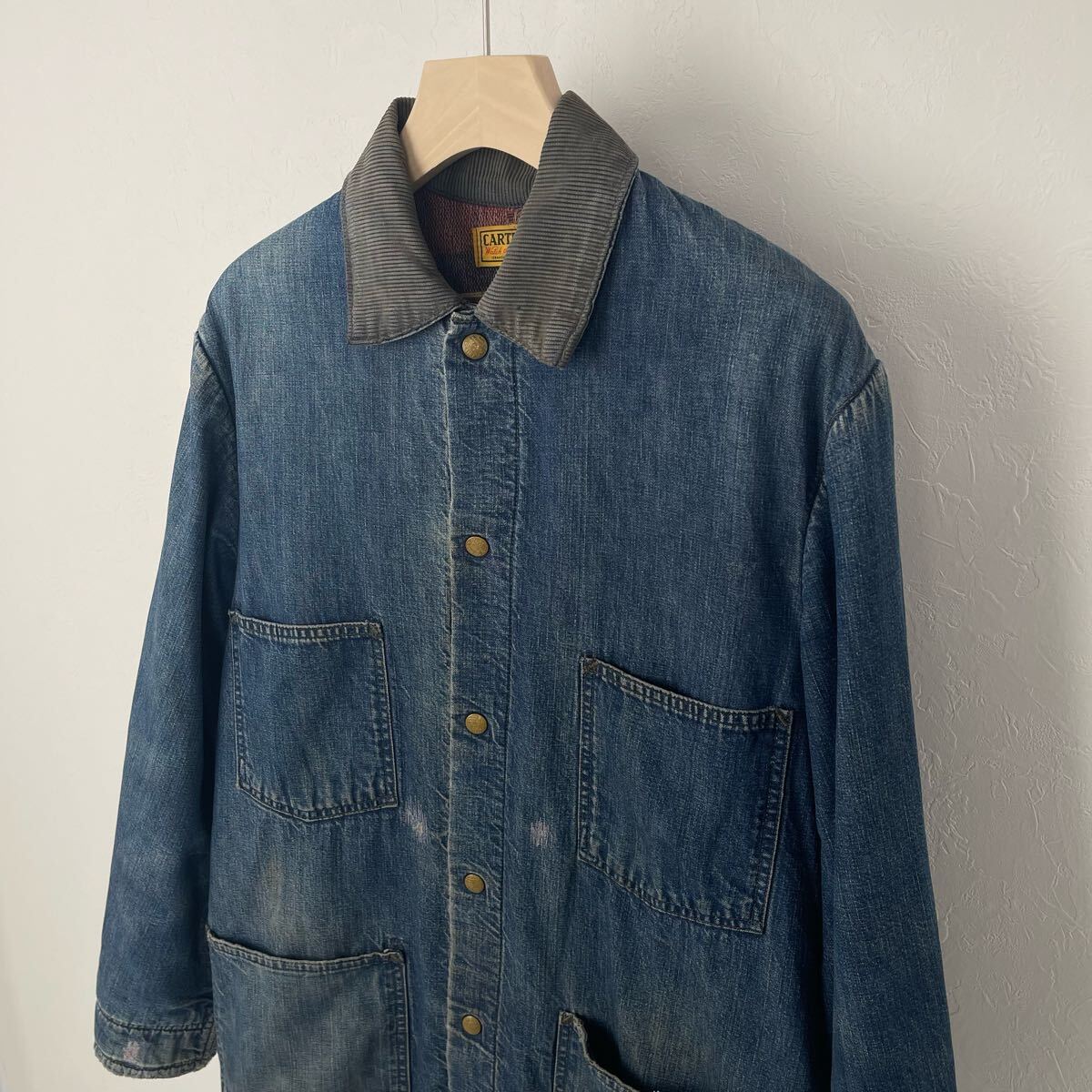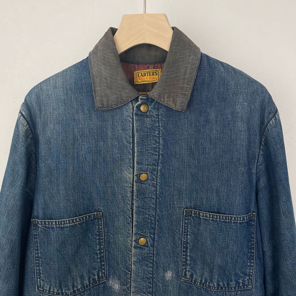 この年代ならではの見返し部分のミミ使いが特徴的。襟のややフェードした黒のコーデュロイや刻印入りのボタンなどとてもかっこいいと思います。
