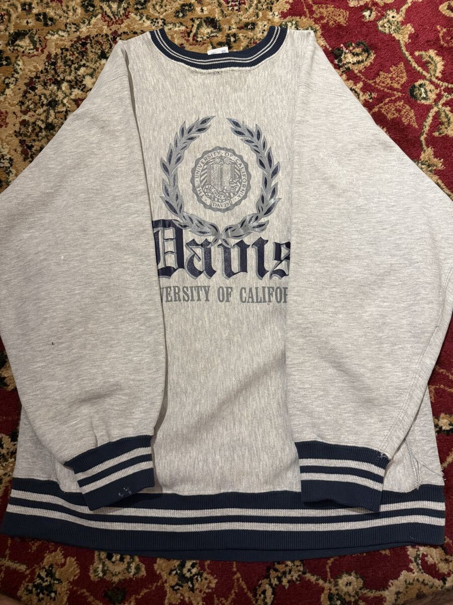 説明:90s チャンピオンのトリコタグカレッジトレーナーです。カリフォルニア州にある世界の大学偏差値ランキングで上位にランク付されたDAVIS Universityのカレッジスウェットです。腰のリブには、ペンキのようなあと、首元に毛のほつれや、ところどころにペンキ、または少し汚れがあります〈写真を参照してください〉。まだ状態はよくこれからの冬に着用していただけます!気にならない方に購入していただきたい所存です。