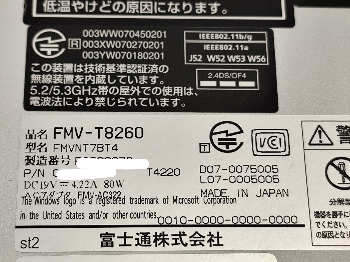y1167 FUJITSU FMV-T8260 FMVNT7BT4 Core 2 Duo T8100 2GB ストレージ無 ジャンク