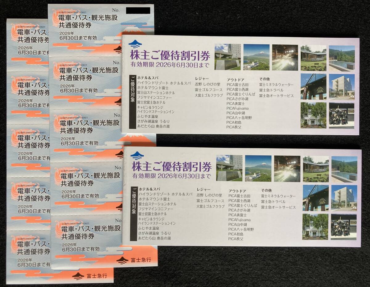 富士急行の株主優待として配付された「電車・バス・観光施設 共通優待券」10枚セットと優待冊子2冊の出品です。