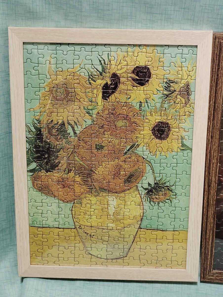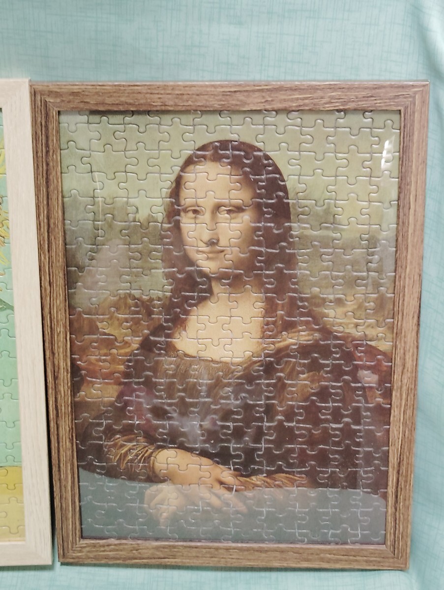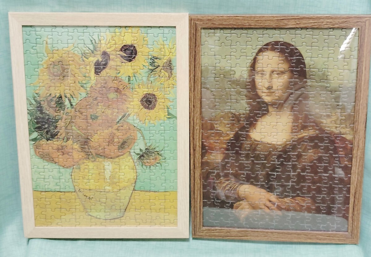 ひまわりとモナリザの絵画アートパズルセット、フレーム付きで飾りやすい。