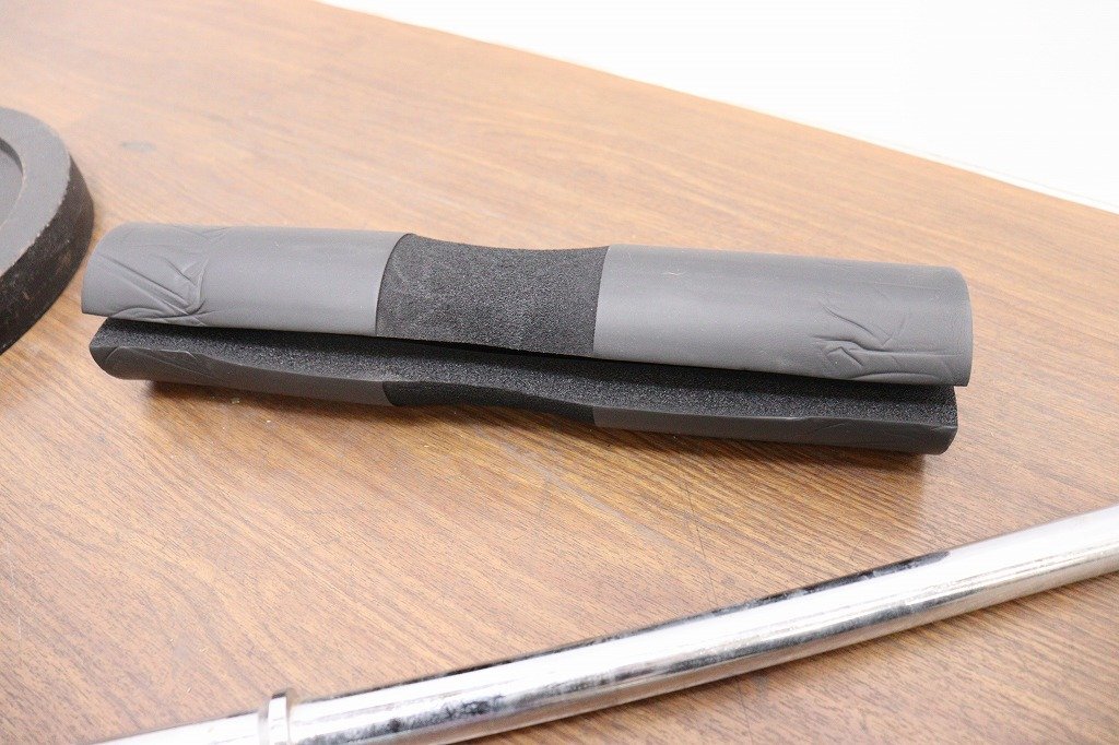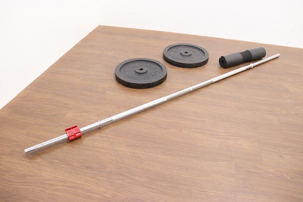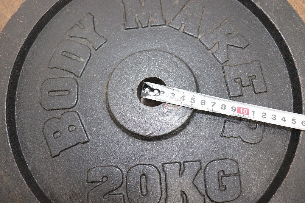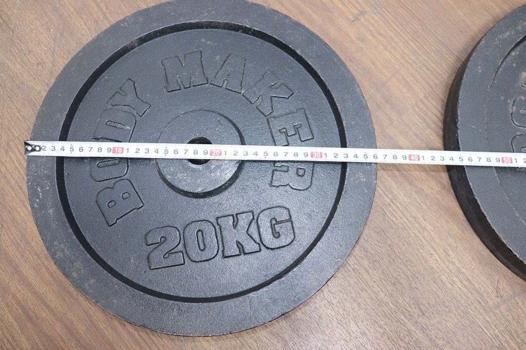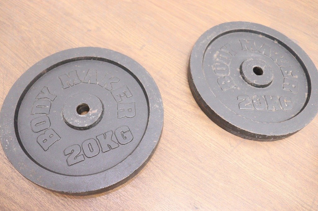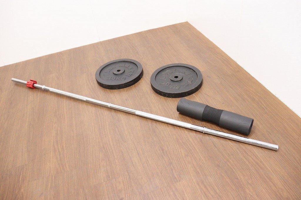 BODYMAKER◆ダンベル・シャフトセット◆20kg×2◆シャフト200cm◆径28mm◆計40kg◆現状品◆スクワットパッド付 | ||