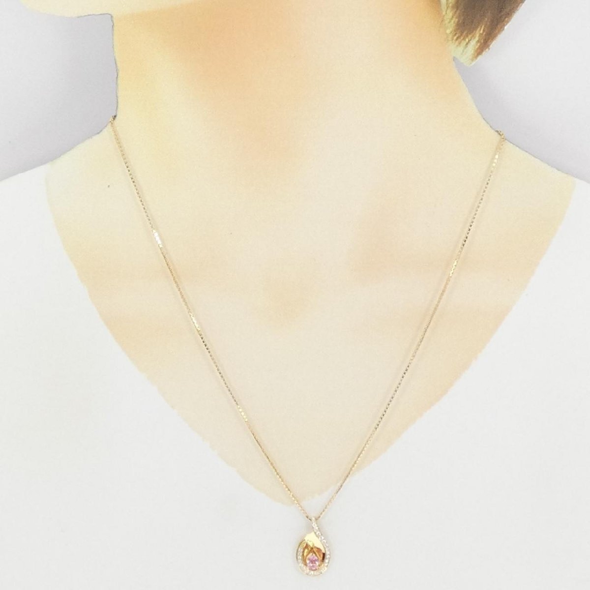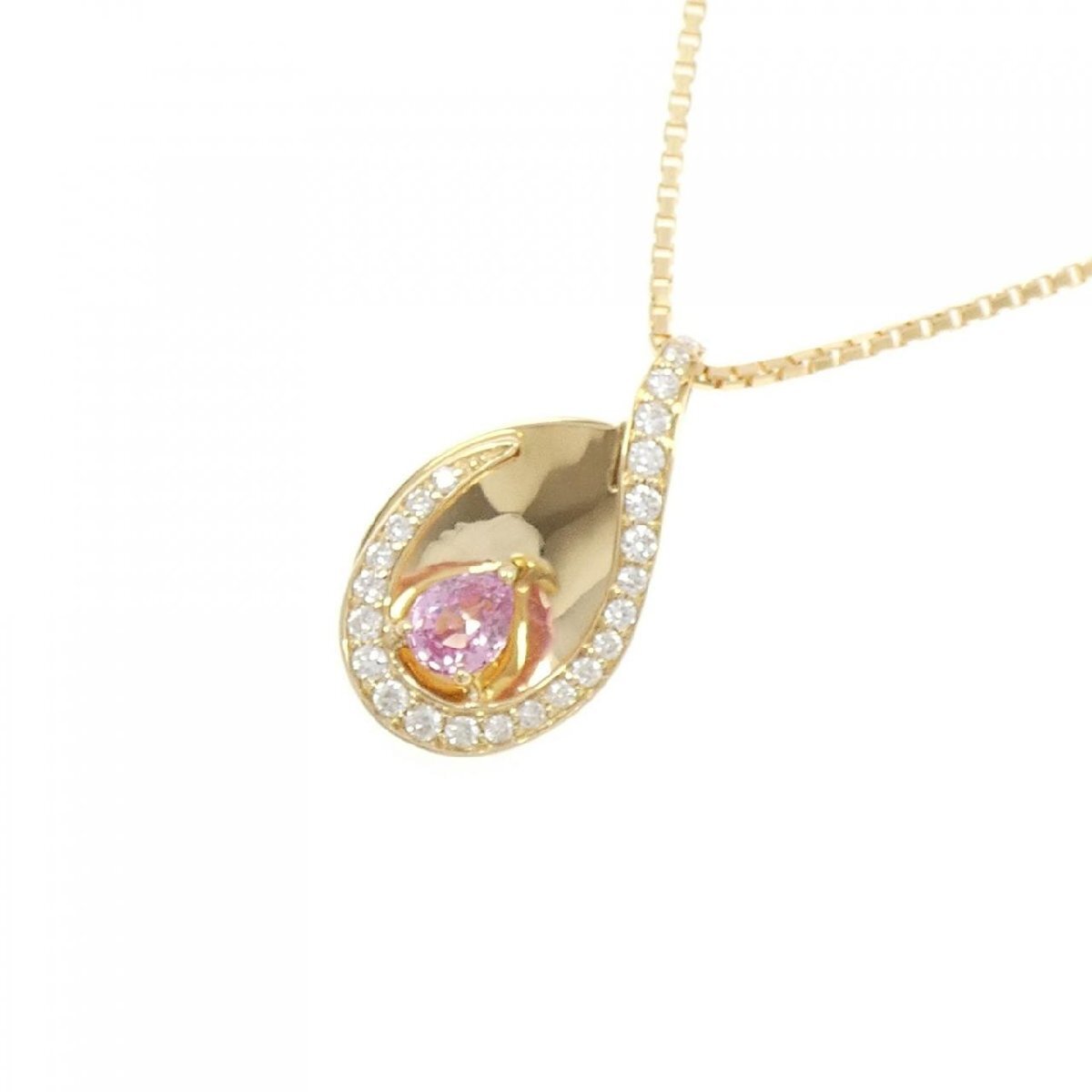 ピンクカラーのサファイヤと透明感のあるダイヤモンドがあしらわれたネックレス。胸元を華やかに飾ります。