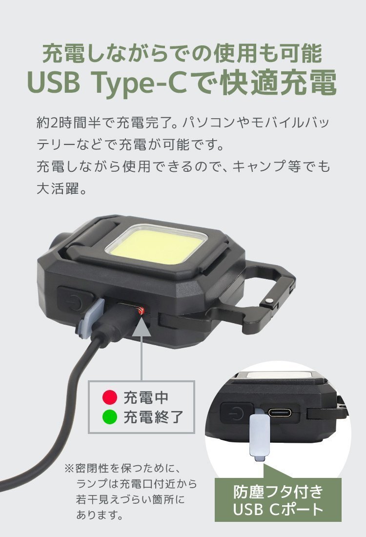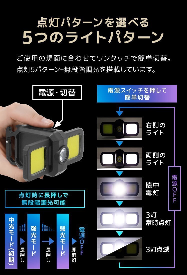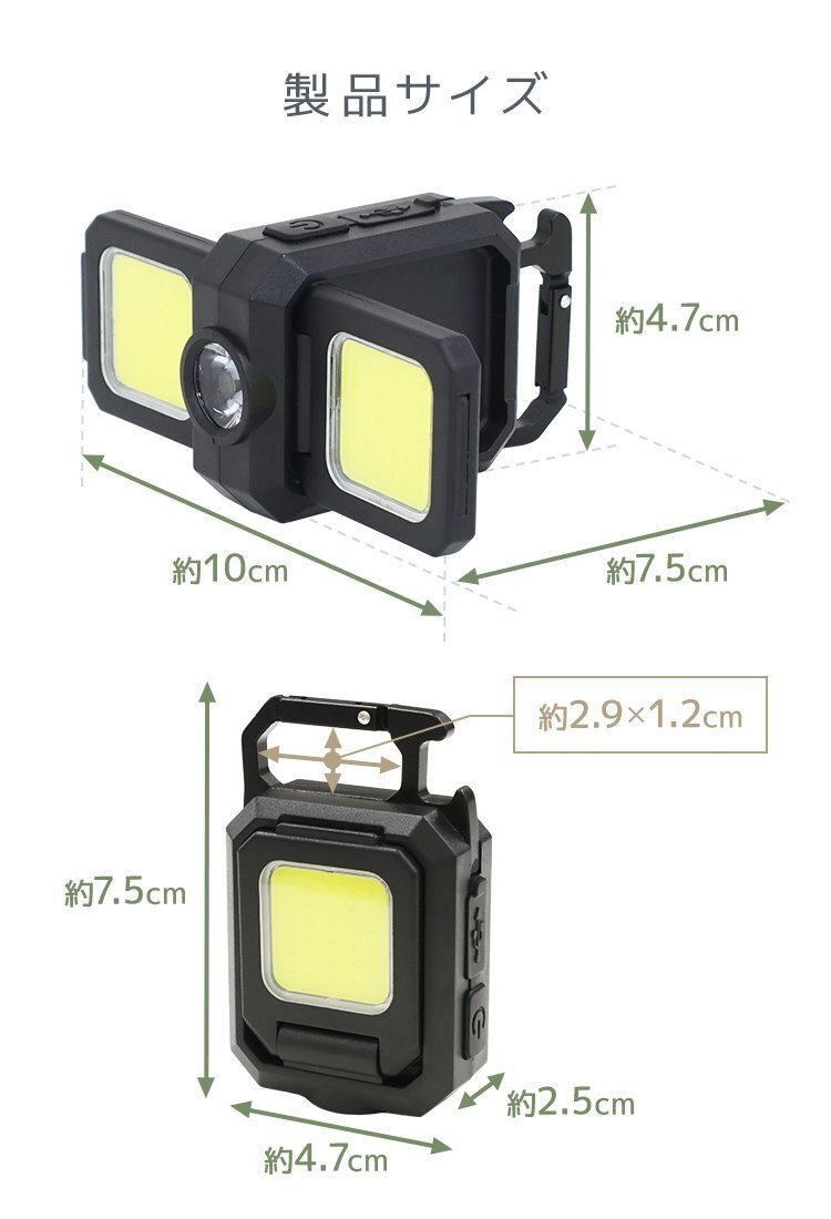 \多機能ミニ投光器が更に進化!/ ライトは合計3つに増量し、両側のライトがそれぞれ90度まで角度調節可能! 必要に合わせて、照らす範囲を調整できるのでとても便利! 明るさは約800ルーメン、点灯もワンタッチで5パターンの切り替えが可能です。 ■90度折り畳み式 ■明るいCOBチップを搭載 ■軽量コンパクト ■磁気性表面に簡単固定 ■生活防水機能付き ■カラビナ付き 【商品内容】 本体×2、USB充電コード×2、日本語取扱説明書×2 【商品詳細】 サイズ(約):4.7×7.5×2.5cm 重量(約):60g 材質:アルミ合金、ABS バッテリー容量:800mAh 充電方式:USB Type-C 点灯モード:5パターン LEDチップ:61個 (LEDライト LED投光器 ハンディライト 野外灯 看板灯 防犯灯 防犯 防水 USB Type-C キーホルダー 散歩 防災 作業 登山 キャンプ 釣り 人気 おすすめ 送料無料 WEIMALL) |
