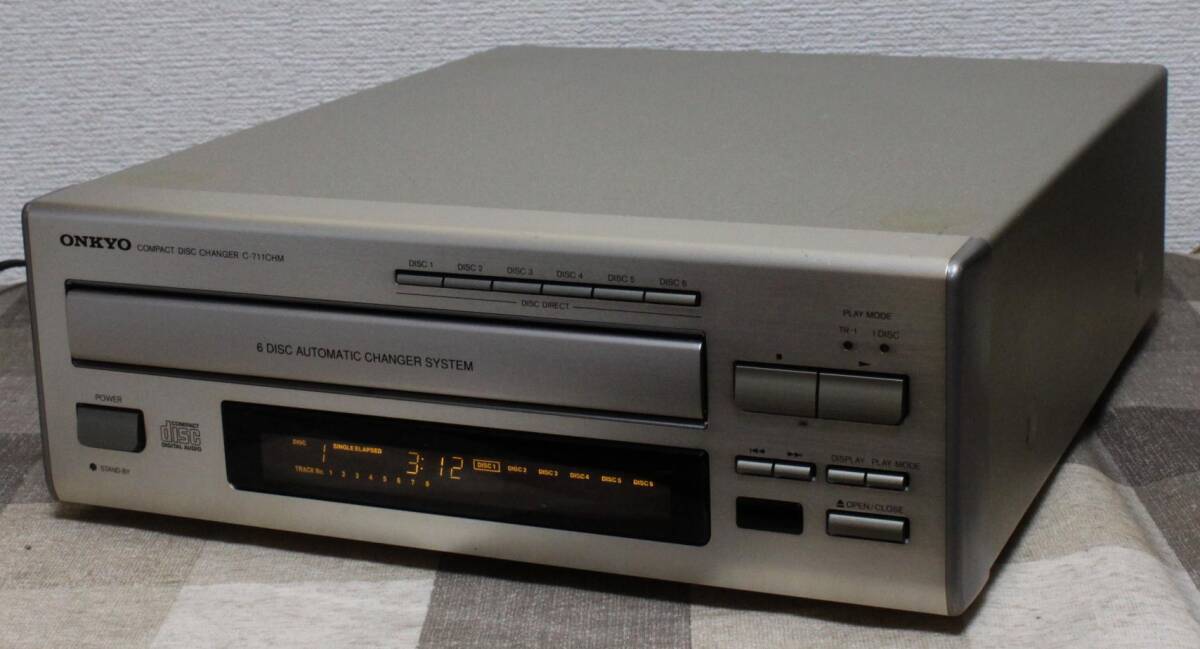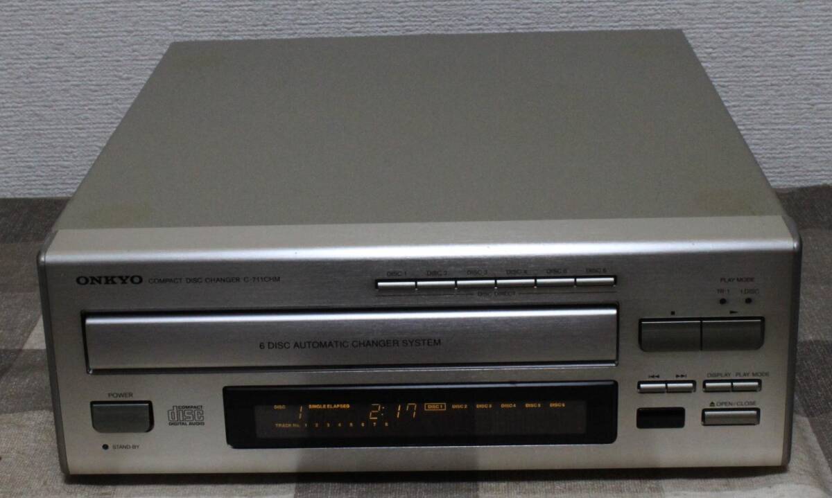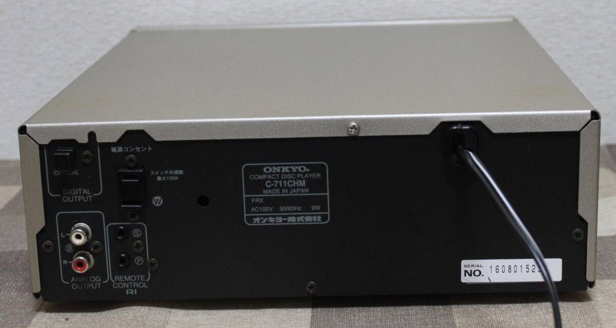 ONKYO の CDプレーヤー C-711CHMです。 6枚のCDを内部のマガジンに収納してトレーを自動的に交換しながら連続再生します。 分解してメンテナンスとクリーニングを行い劣化部品は交換しました。 ピックアップとベルトは新品に交換しました。 駆動用のゴムベルトを全て交換しましたのでディスクチェンジ等の動作はスムーズです。 メーカー公表の<スペック>は以下のとおりです。 ●形式 :光学式コンパクトディスクプレーヤー ●D/Aコンバーター :シングルビット方式 ●周波数特性 :5Hz~20kHz ●全高調波ひずみ率 :0.005%以下 (1kHz) ●チャンネルセパレーション :90dB以上 (1kHz) ●ダイナミックレンジ :96dB以上 ●SN比 :100dB以上 ●ワウ・フラッター :測定限界以下 ●出力レベル :2Vrms (アナログ) ●消費電力 :9W (電気用品取締法) ●寸法 :275W×98.5H×327Dmm ●質量 :4.2kg ●出力 :デジタル1 (光) アナログ1 | |||