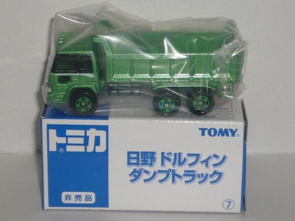 [非売品]トミカ 日野 ドルフィン ダンプトラック 緑です。箱に少し傷みがありますので、ご了承の上入札下さい。商品の状況は写真でご判断の上、ノ-クレ-ム・ノ-リタ-ンでお願いします。保証はできませんが、定形外郵便での発送も可能です。