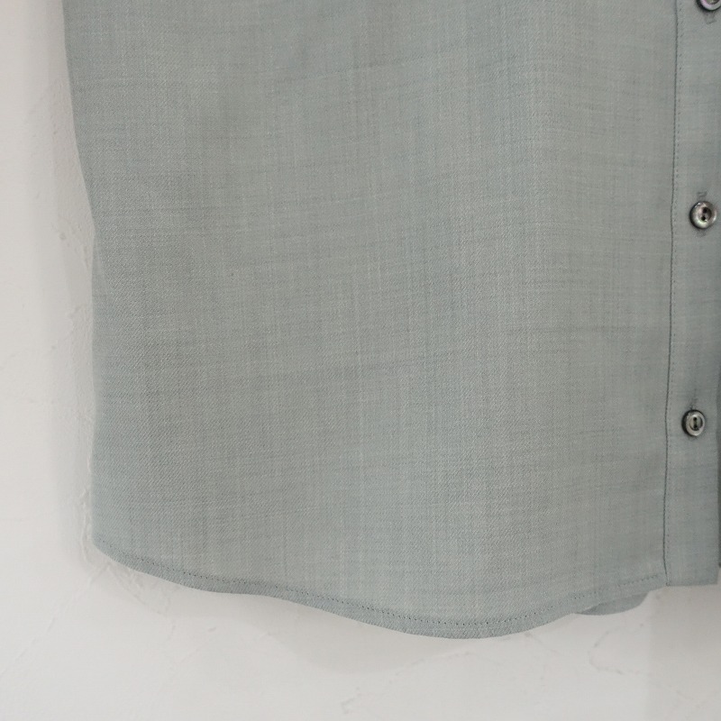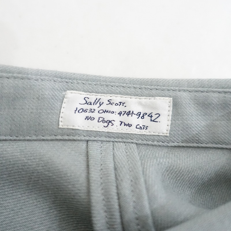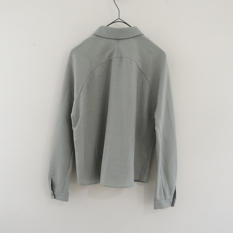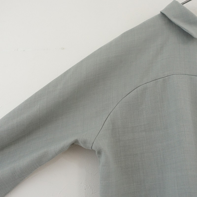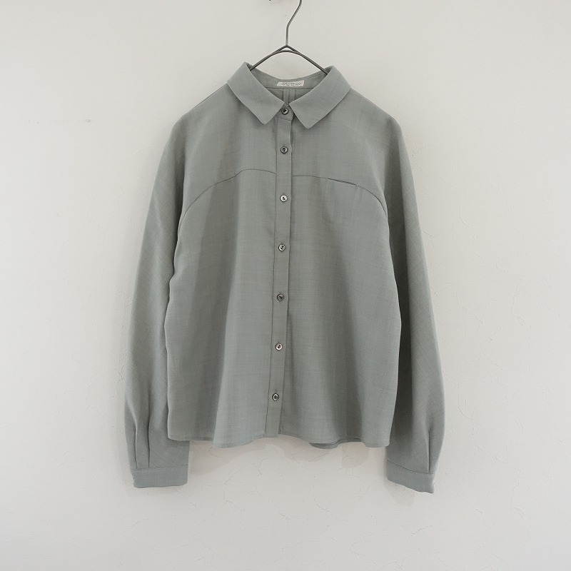 Sally Scottのウール混ブラウスです。カラーはミックスくすみグリーンで、少し薄手素材です。フロントボタン開閉式で、デザイン切替が施されたラグラン風スリーブで袖口にタックが施されております。左胸にポケットがあり、裾はラウンドカット仕様になっております。 |