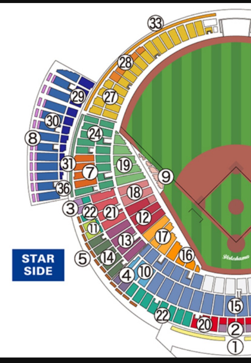 内野S指定席STAR SIDE(3塁側)端席含むですので、写真2枚目⑰の端席含む連番ですので、出入り楽で、ゆったり観戦にも適しております