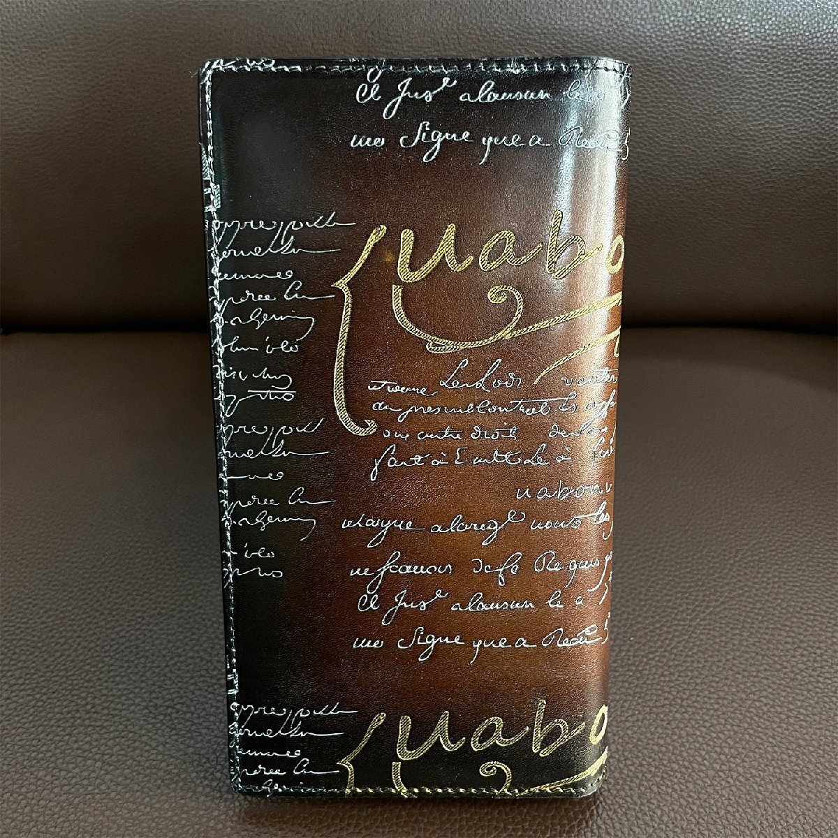 染料の開発成功は製作の一番重要な問題の解決に繋がり、職人が一つ一つの工程にこだわり作り上げた牛革長財布です。一番こだわりの工程はカリグラフィーの彫り込みと革の着色です。