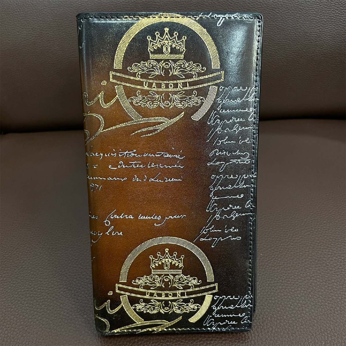 手触り感触が良くアンティーク風な財布と仕上がりました。角の部分は丸みを帯びた設計になっており、全体的にカリグラフィーとゴールデン/シルバーパティーヌがデザインされております。色艶、柔かさに優れていて高級感溢れる逸品となります。