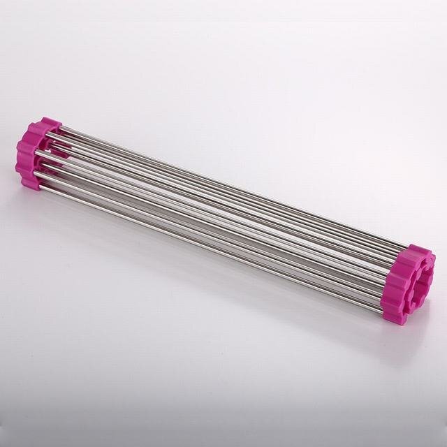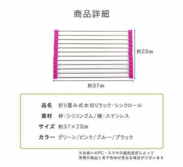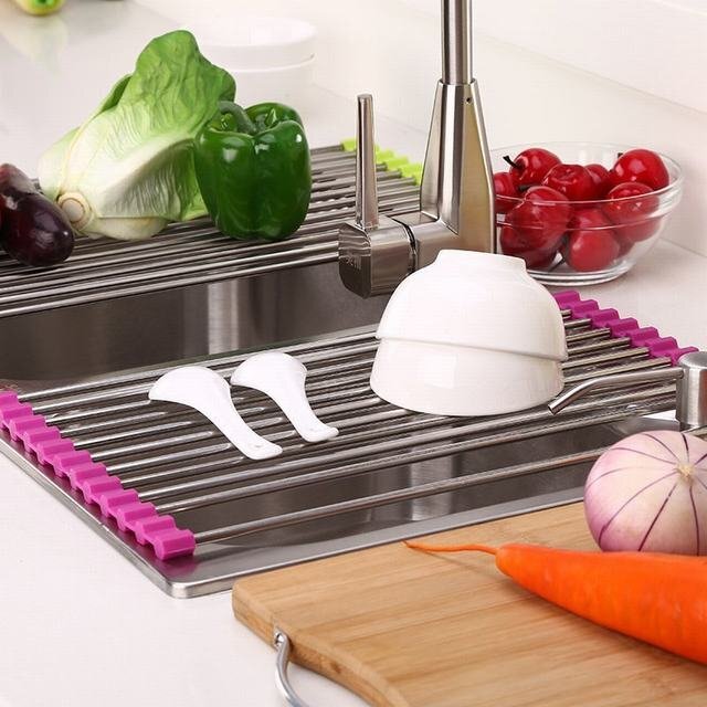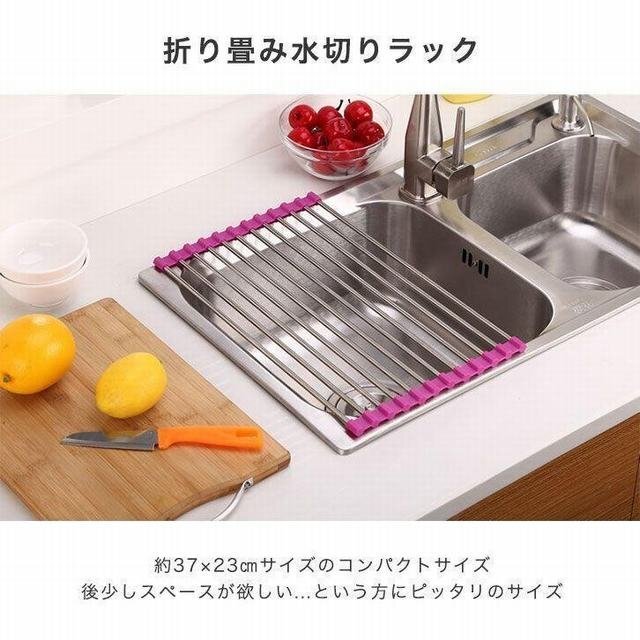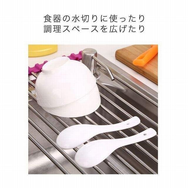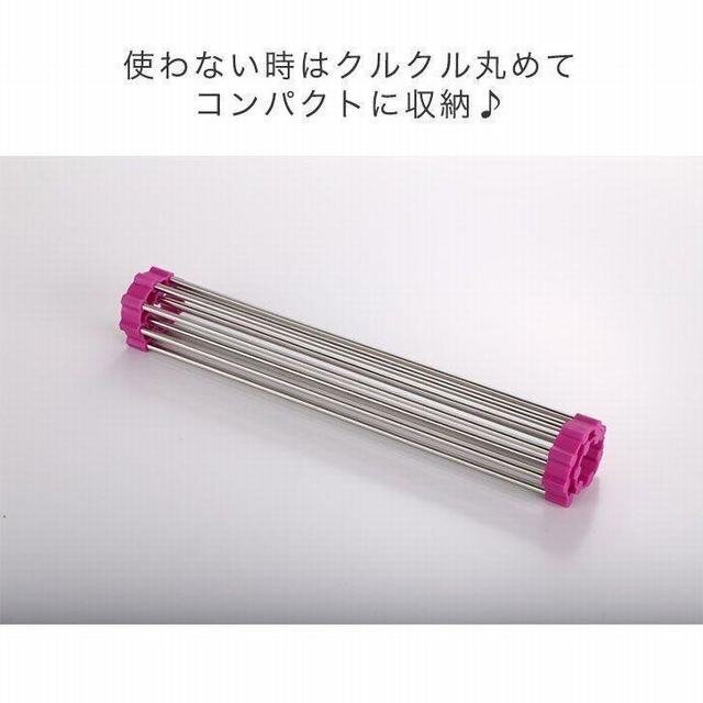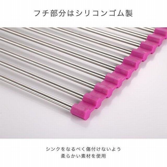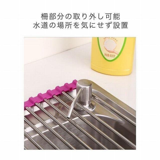 デッドスペースであるシンクの上スペースを活用して お皿もカトラリーも水切りできる嬉しいラック。 サイドがシリコンゴムだから、くるんと巻いてコンパクトサイズに 収 納しておけるのがポイントです!これなら調理スペースも 広々と活用することができます"