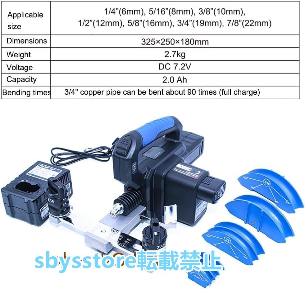 ---[パラメータ] - 適用: 軟銅/アルミニウム管のみ。適用チューブ外径: 1/4"、5/16"、3/8"、1/2"、5/8"、3/4"、7/8"、適用壁厚: 0.027"-0.059"( 0.7mm~1.5mm)、曲げ角度:0~90°。