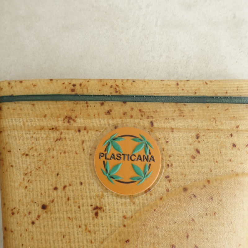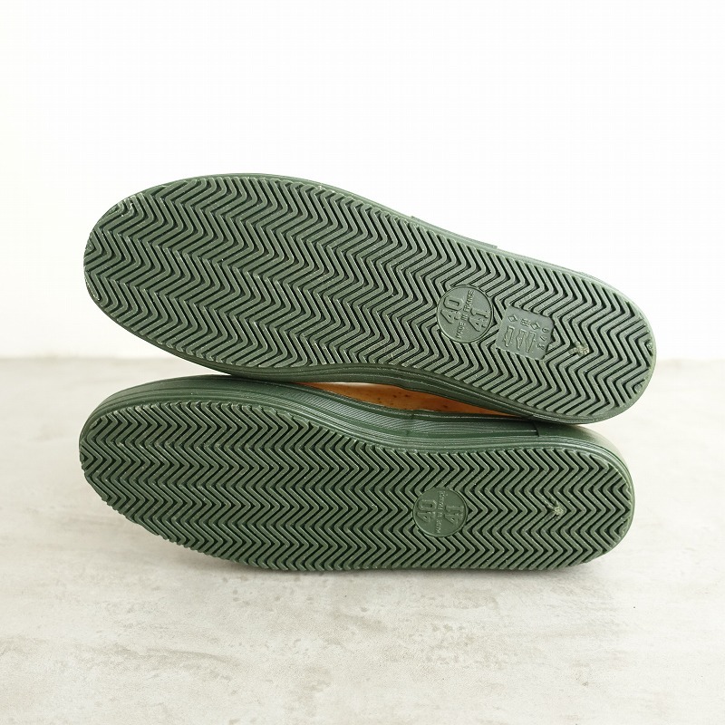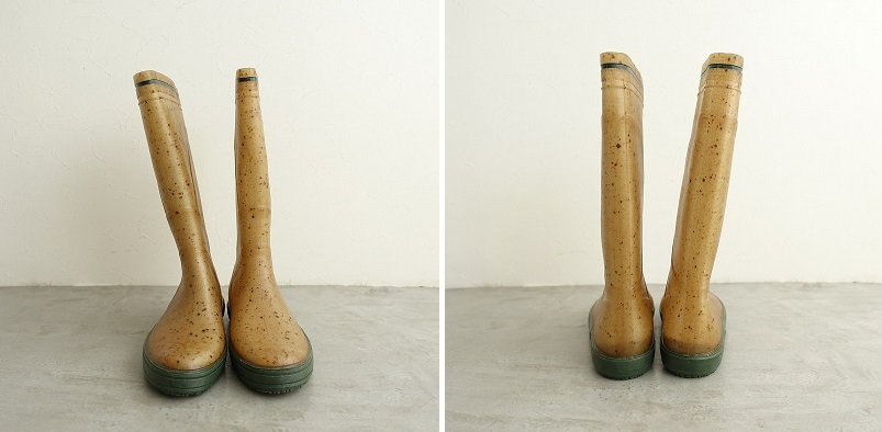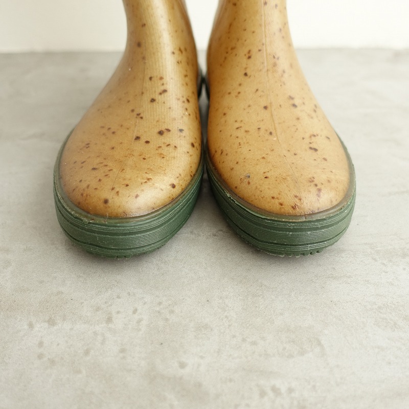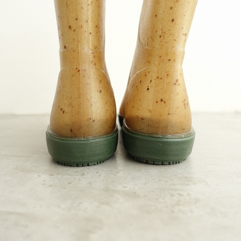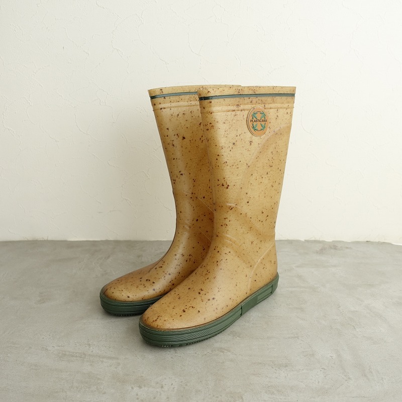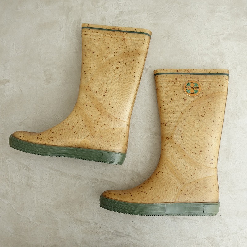 | PlasticanaのBOATANA BOOTSです。カラーは透け感のあるくすんだベージュ系で、ブラウンの繊維が混ざっております。履き口周りのライン、ソールはグリーンです。 |