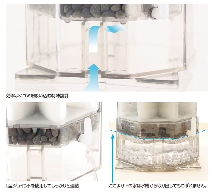 商品紹介お手持ちの水作エイトコアMの物理ろ過能力を大幅にUPさせることができます。使用方法1.別売の水作エイトコアM(以下、本体)のL型ジョイントを取り外してください。2.本体のL型ジョイントがついていた穴と本品の穴をあわせるようにして、本体を本品に差し込んでください。3.L型ジョイントを本体に戻してください。4.水槽へのセット方法は本体の説明書を参考にしてください。