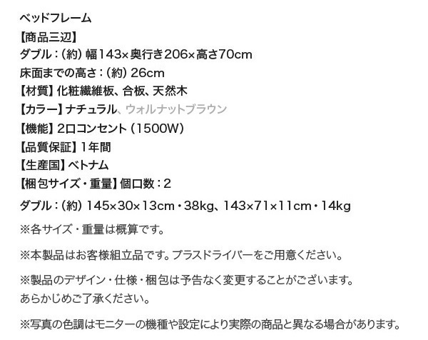 ![]() 棚・コンセント付きデザインすのこベッド Camille カミーユ プレミアムボンネル付 ダブル ナチュラル×ホワイト ![]() ![]() 配送について 納期:入金確認後4営業日内(土日祝除く)に発送いたします。 ※お支払いは、代引き不可となります。 ※お届けは玄関渡しです。他の商品と同梱はできません。 ※北海道へのお届けは送料が発生します。 沖縄・離島は配送不可ですので、予めご了承ください。 離島について:本州・本島などと橋でつながっている場合にも該当致します。 その他一部地域についてお届けができかねる場合があります。 お届け地域についてご不明な点は、ご注文前に質問欄よりお問い合せくださいませ。 内容によりましては、返答にお時間を要する場合がございます。 在庫状況について ・在庫状況は日々変動しており、お支払いのタイミングによっては メーカー在庫が欠品となる場合がございます。 ・生産状況や同時注文等により、欠品となる場合もございます。 ・在庫切れの場合はキャンセルとしてお受けいたします。 ・最新の在庫状況のご確認は、質問欄よりお問い合せくださいませ。 ご注意ください ・土日祝はお休みさせていただきます。 ・初期不良の場合はお届け後1週間以内に限り返品交換対応可能です。 ・到着後、破損不良等の有無をお確かめ下さい。 ・返品・交換は、配送時の梱包のまま使用いただくようお願いします。 なお梱包材が無い場合でのお引取りはできませんのでご注意下さい。 ・お客様都合によるイメージ違い、サイズ間違い等の事由では、 交換・返品・キャンセル等お受けできません。 ご不明点などありましたらお気軽にお問い合わせください。 すぐにお返事できない場合もございますので、余裕をもってのお問い合せをお願い致します。 b500041856ntwh 100051639 |
