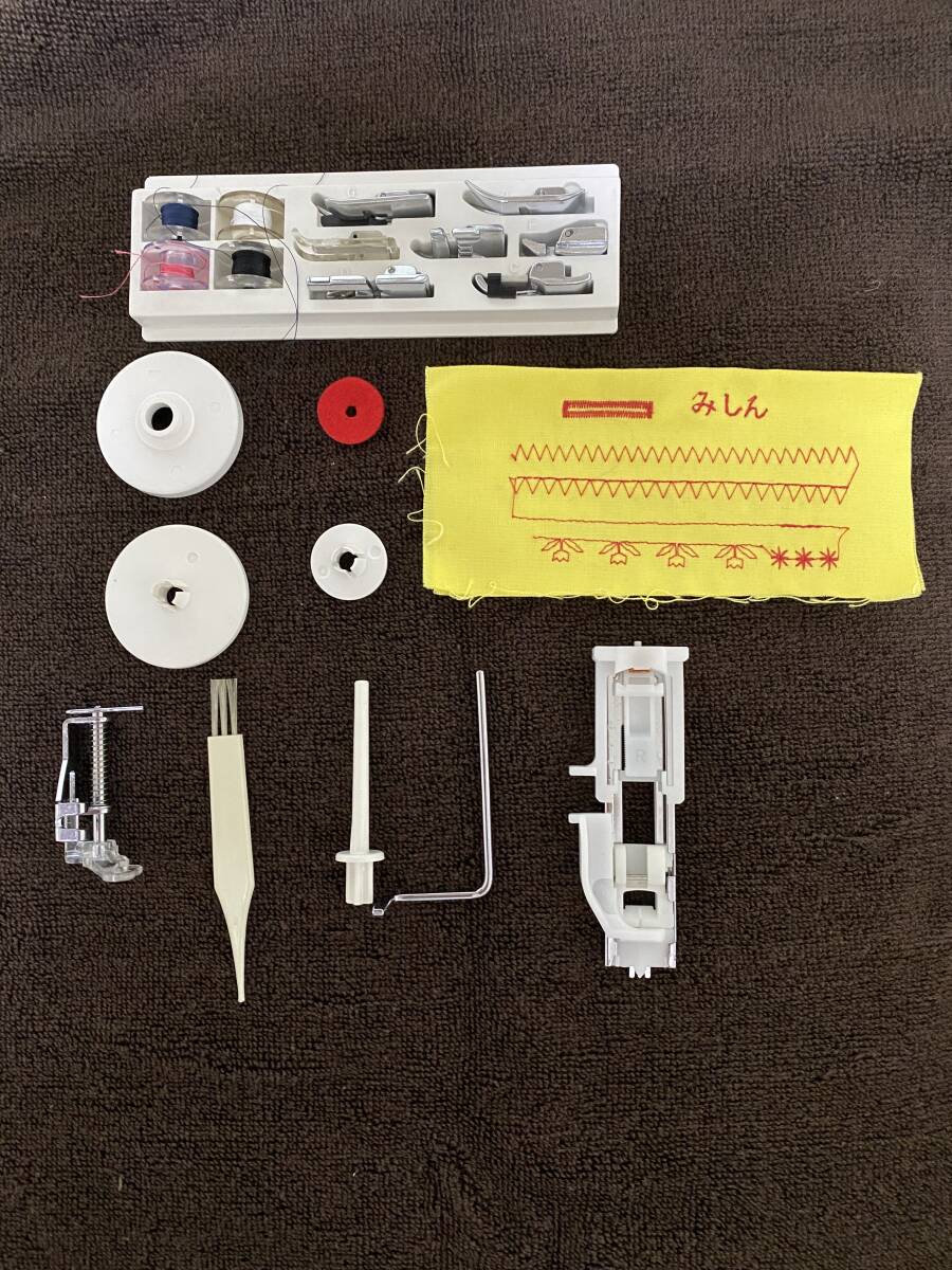 画像にある付属品は全てお送りしますが、試し縫いの布だけ眼鏡拭きに使ってしまったのでお送りできません。