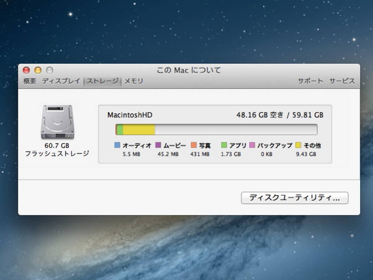 | Apple MacBook Air A1369 (13-inch, Mid2011)/Core i7 1.8GHz/4GBメモリ/SSD64GB/USキーボード/OS X Mountain Lion10.8.5 #1002 | ||